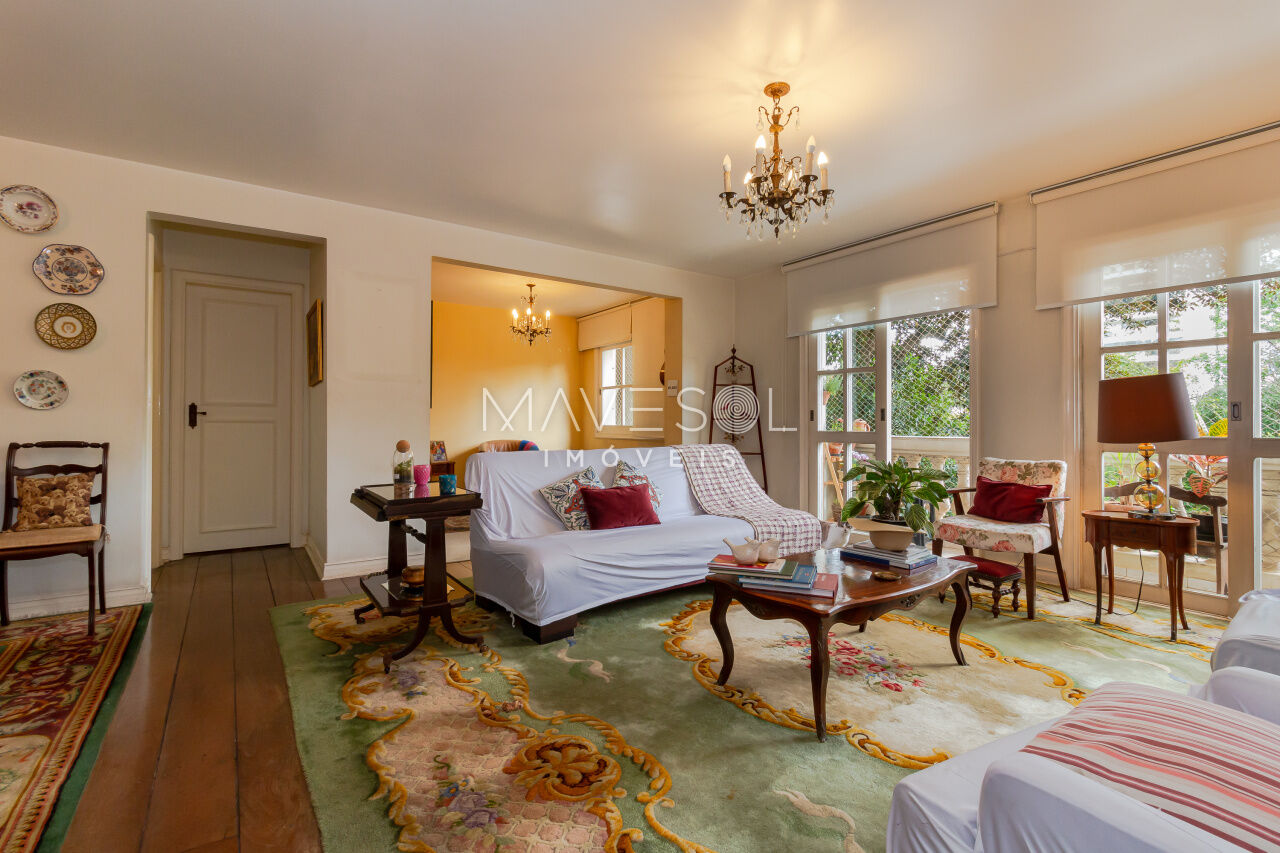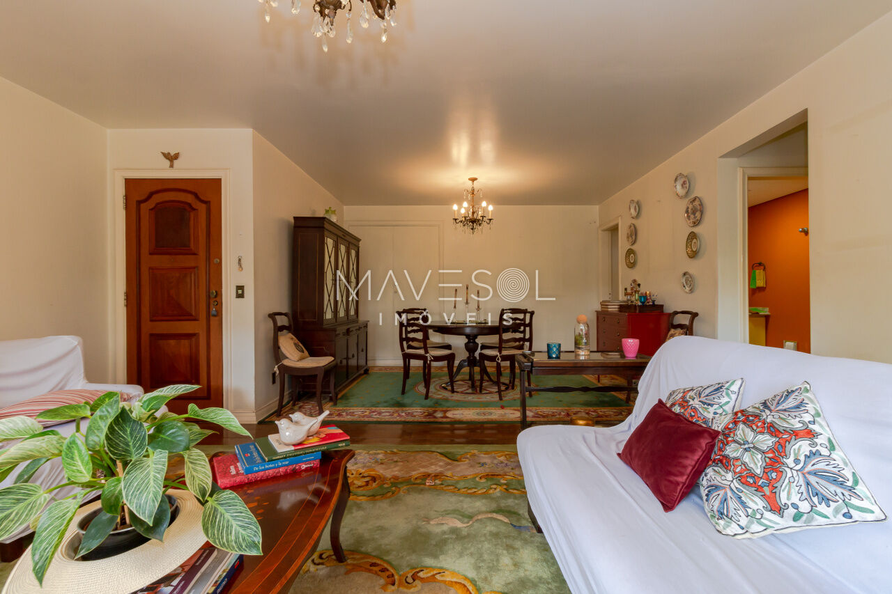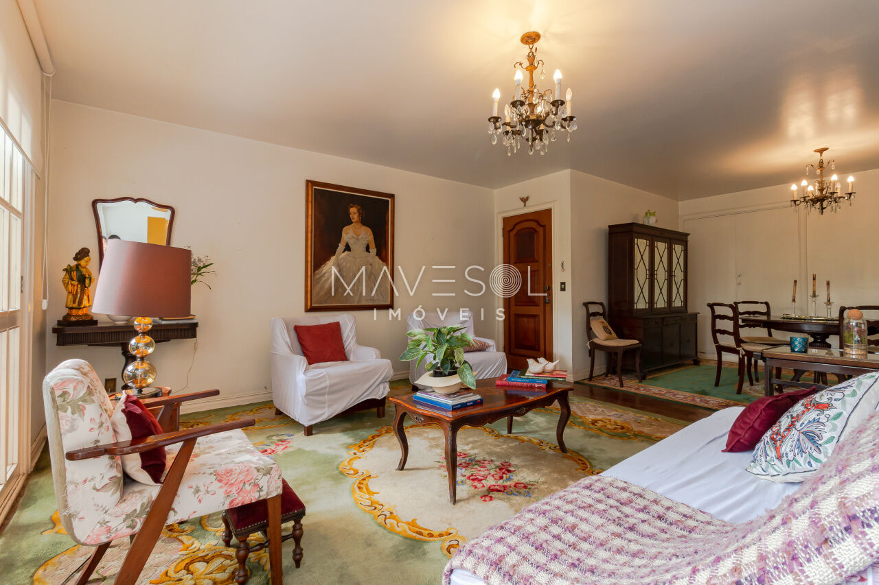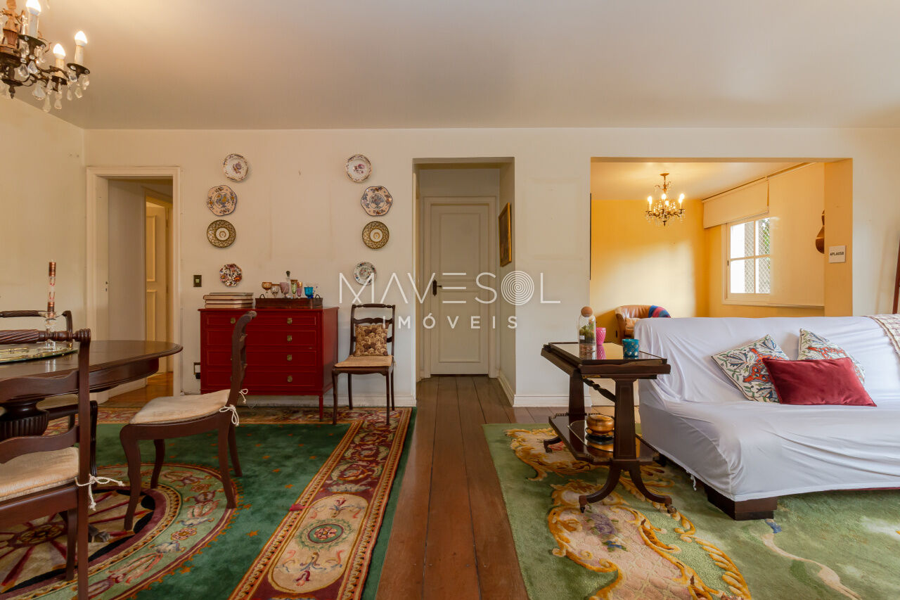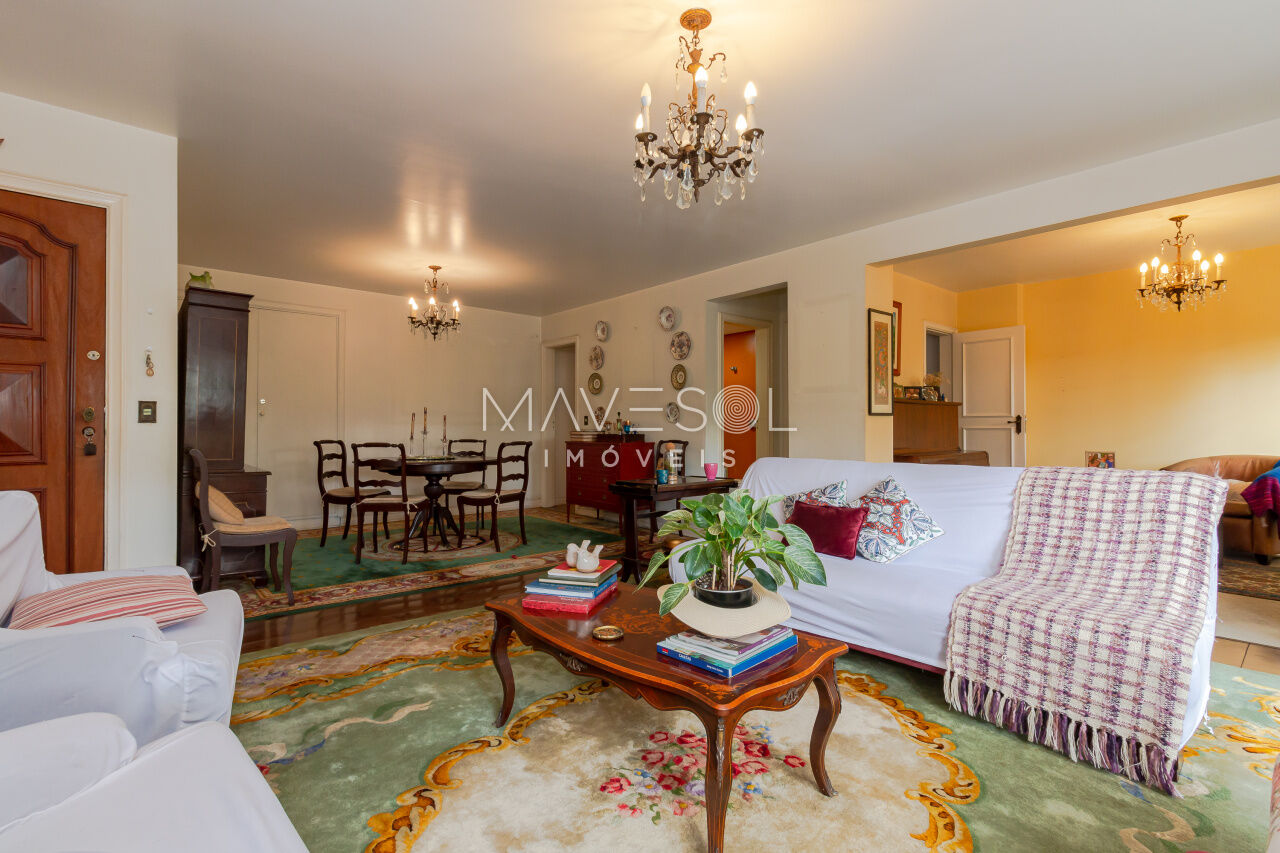 A sacada tem duas portas-balcão no living, permitindo muita entrada de luz natural e oferecendo um espaço ideal para criar dois ambientes confortáveis. O piso de tábua corrida complementa o estilo clássico, em perfeita harmonia com a arquitetura do prédio.