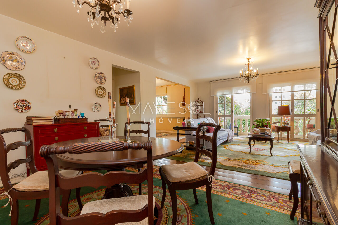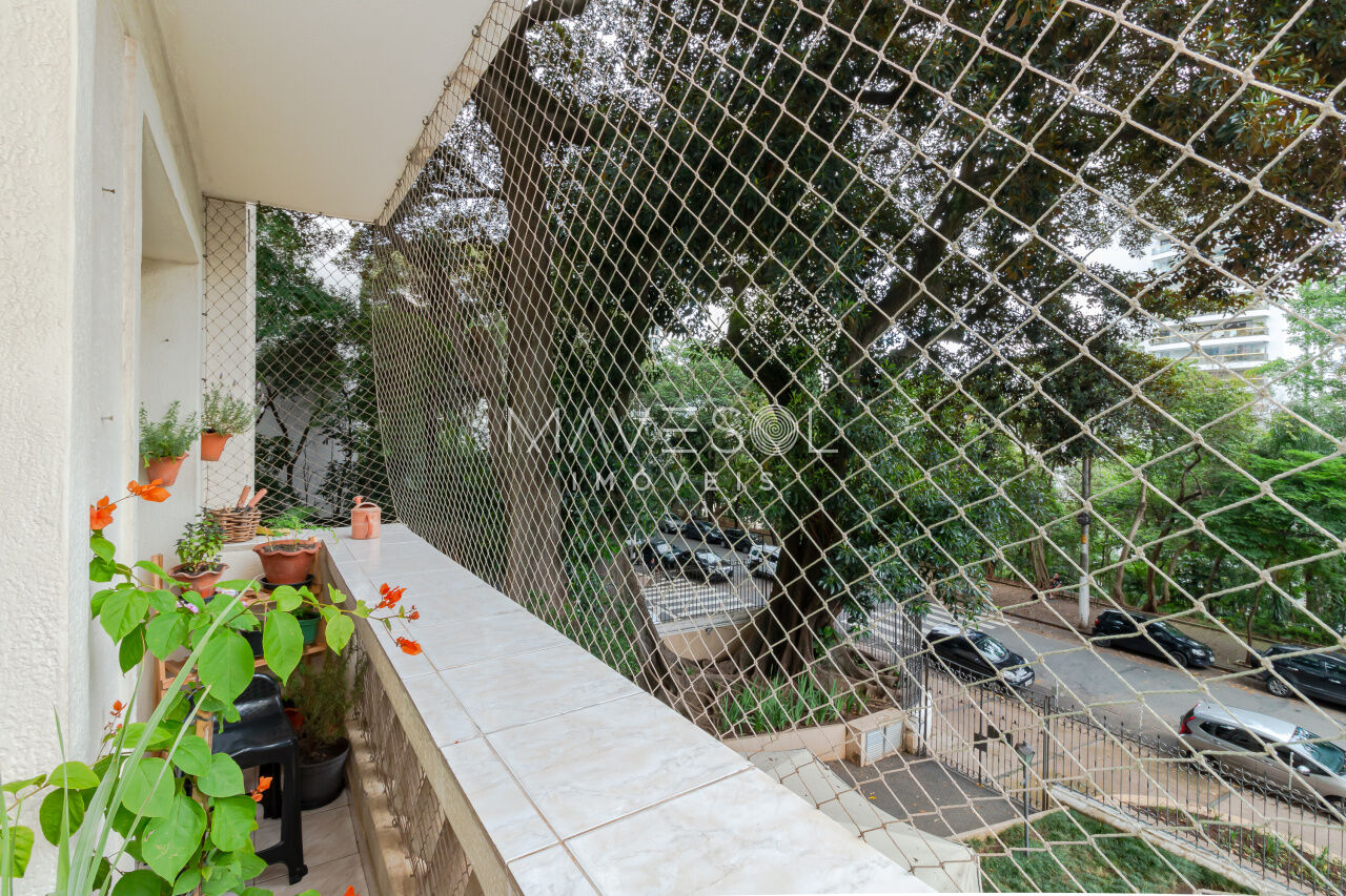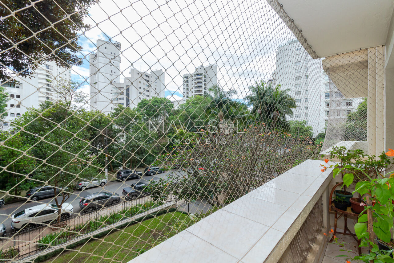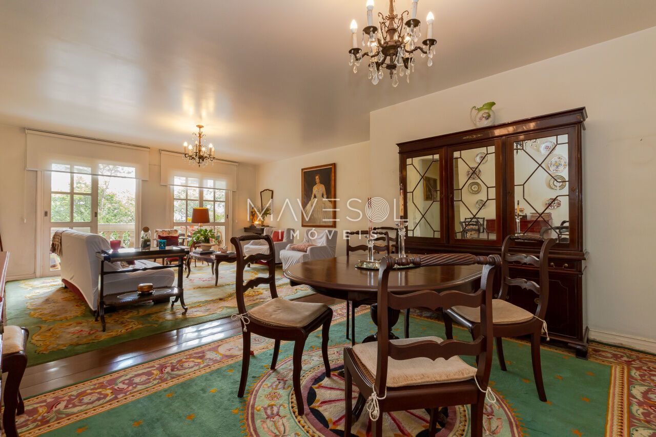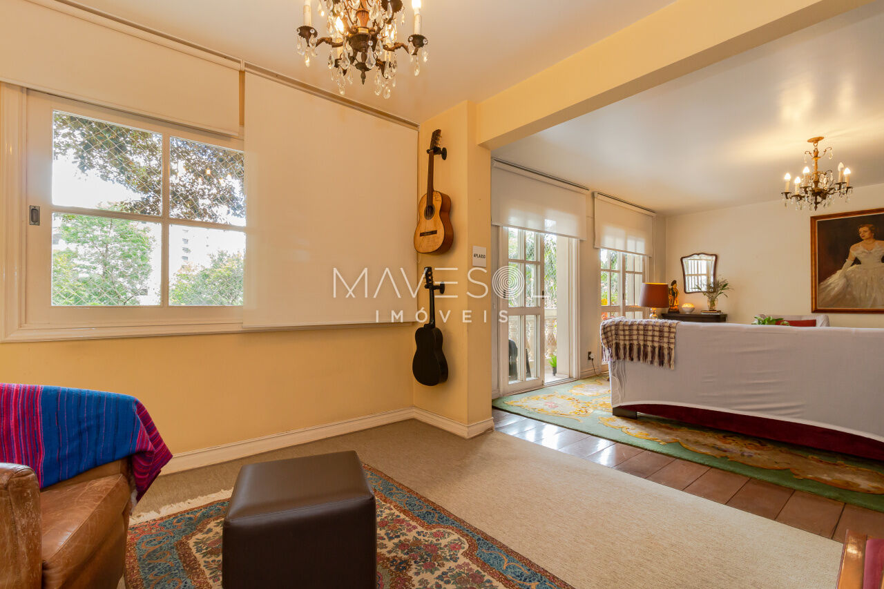 A sacada tem duas portas-balcão no living, permitindo muita entrada de luz natural e oferecendo um espaço ideal para criar dois ambientes confortáveis. O piso de tábua corrida complementa o estilo clássico, em perfeita harmonia com a arquitetura do prédio.