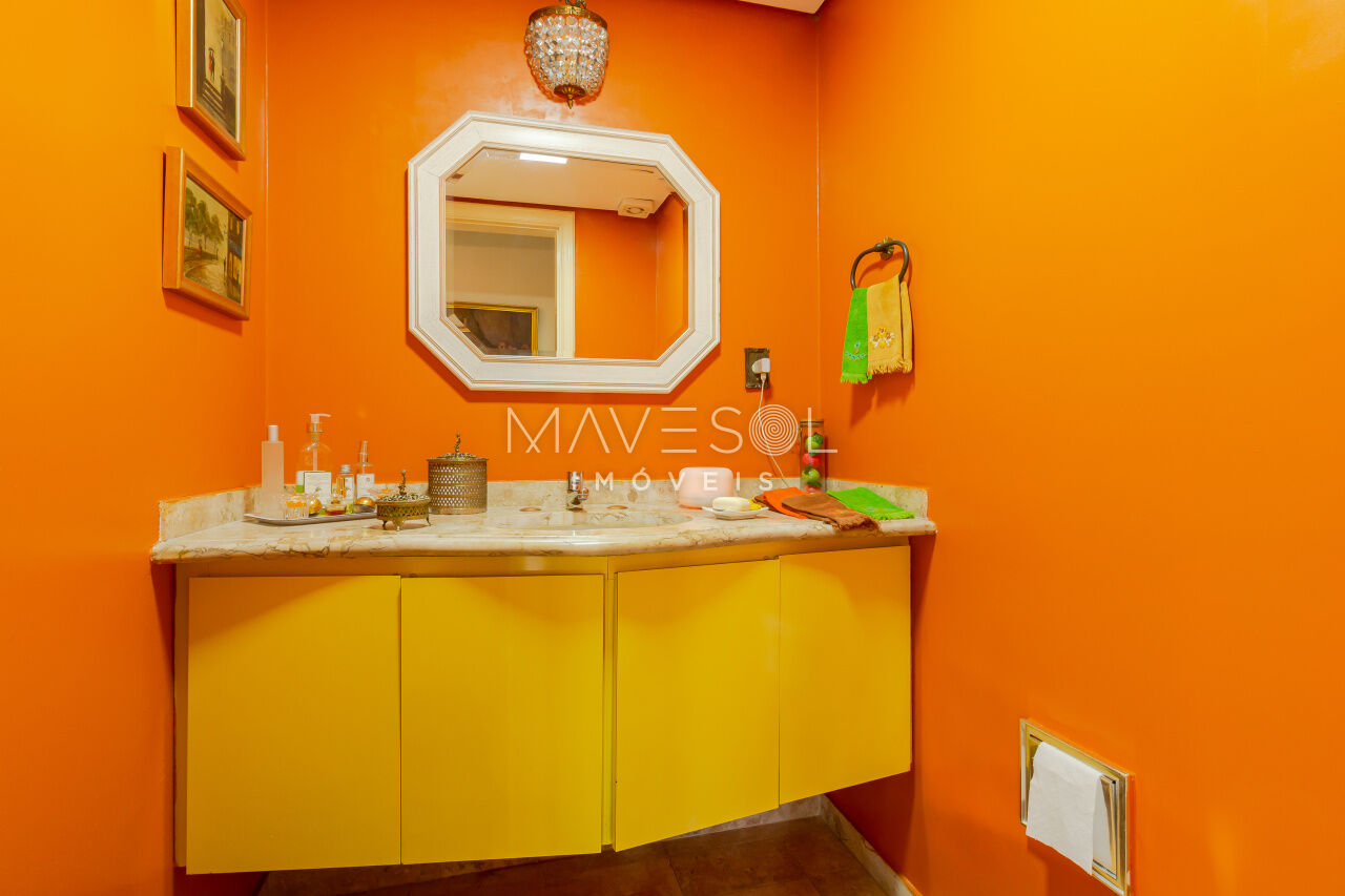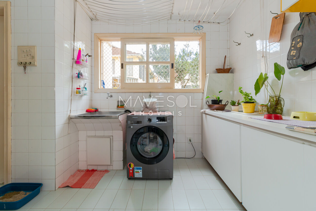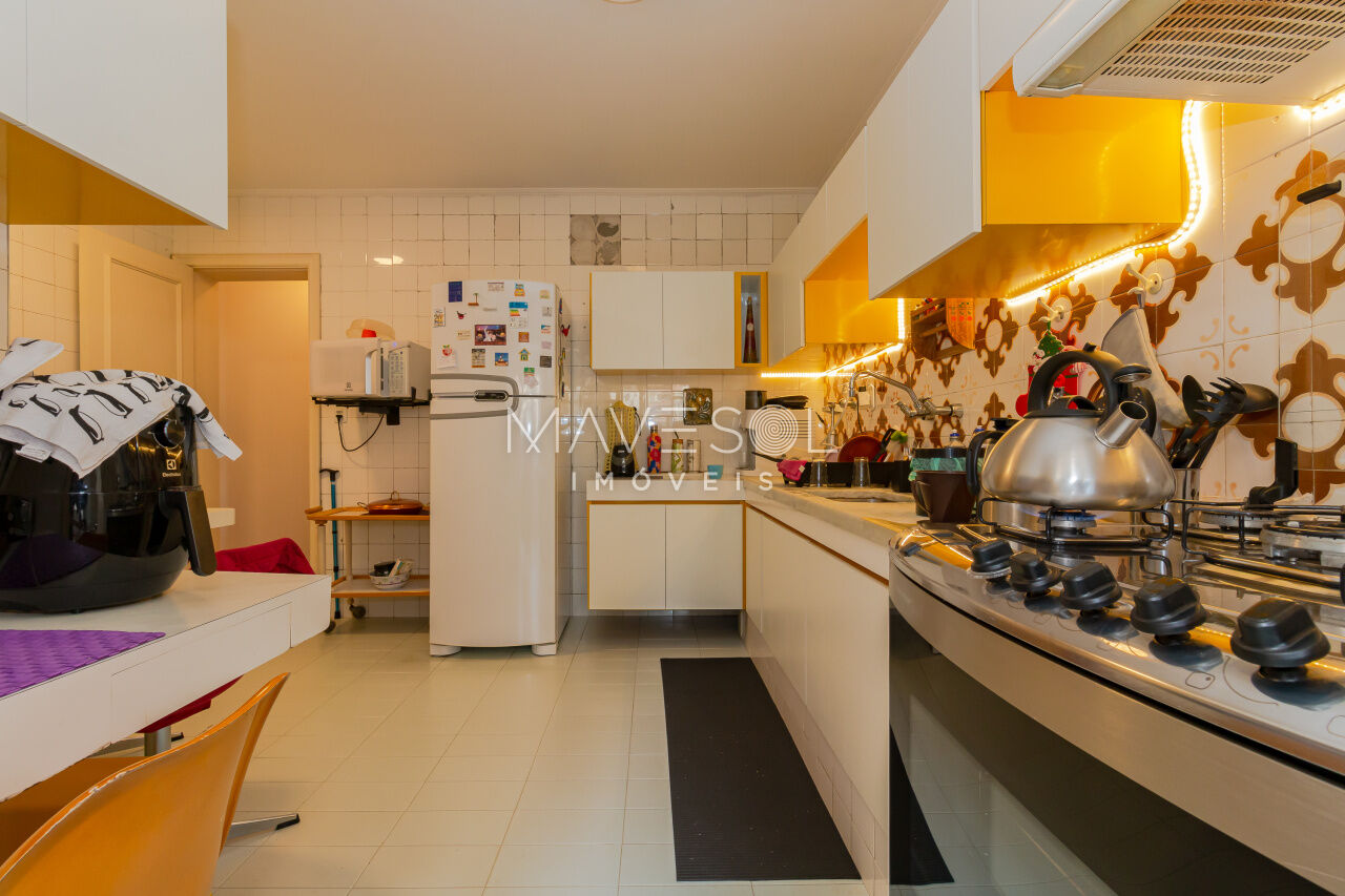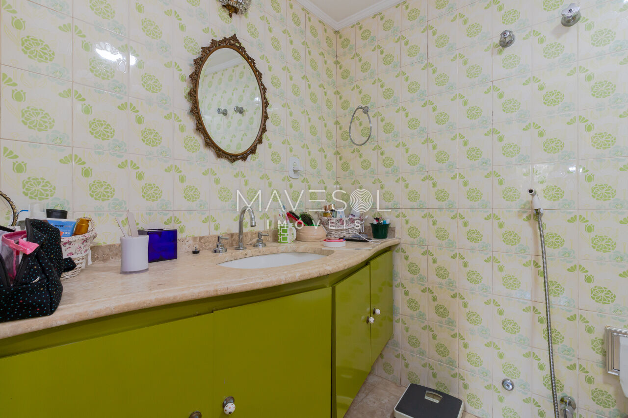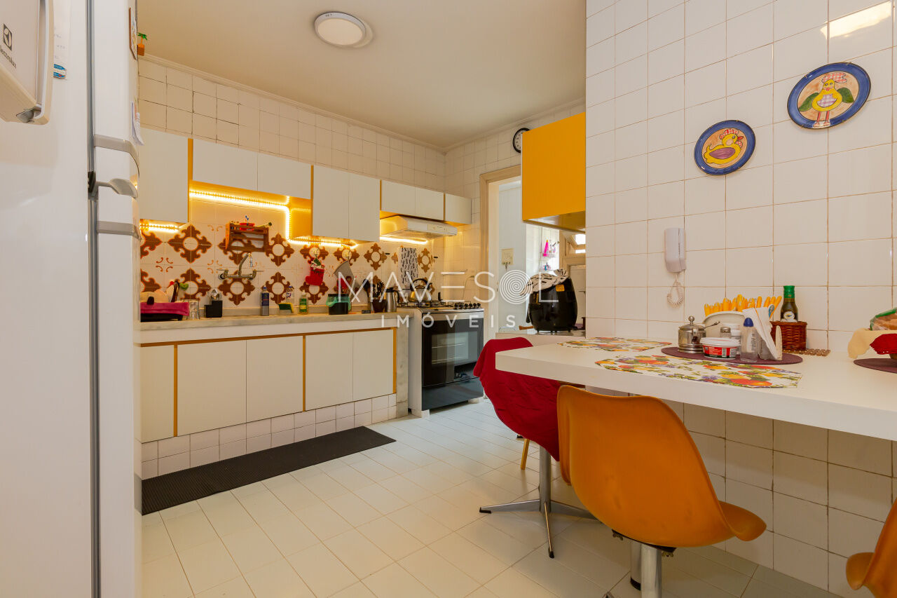 A área fria, incluindo cozinha, área de serviço e banheiros, pede uma atualização de azulejos, louças e ferragens, o que cria uma excelente oportunidade para personalizar o espaço. Para quem prefere menos áreas privativas, abrir algumas paredes daria ainda mais brilho ao ambiente.