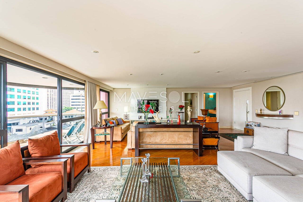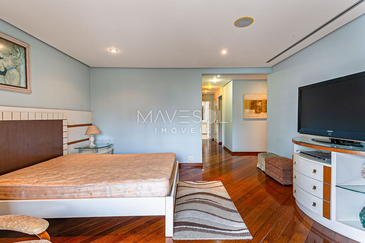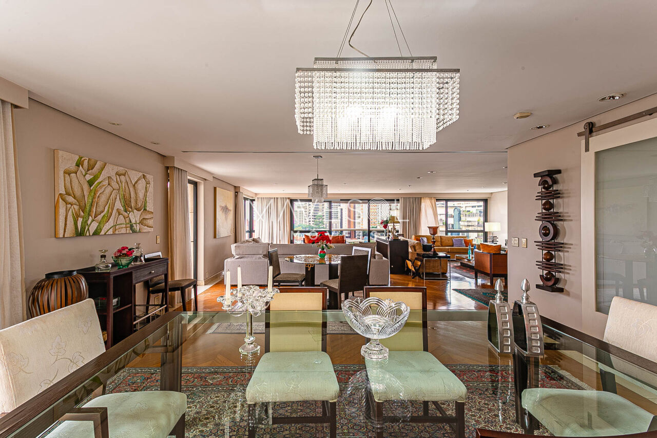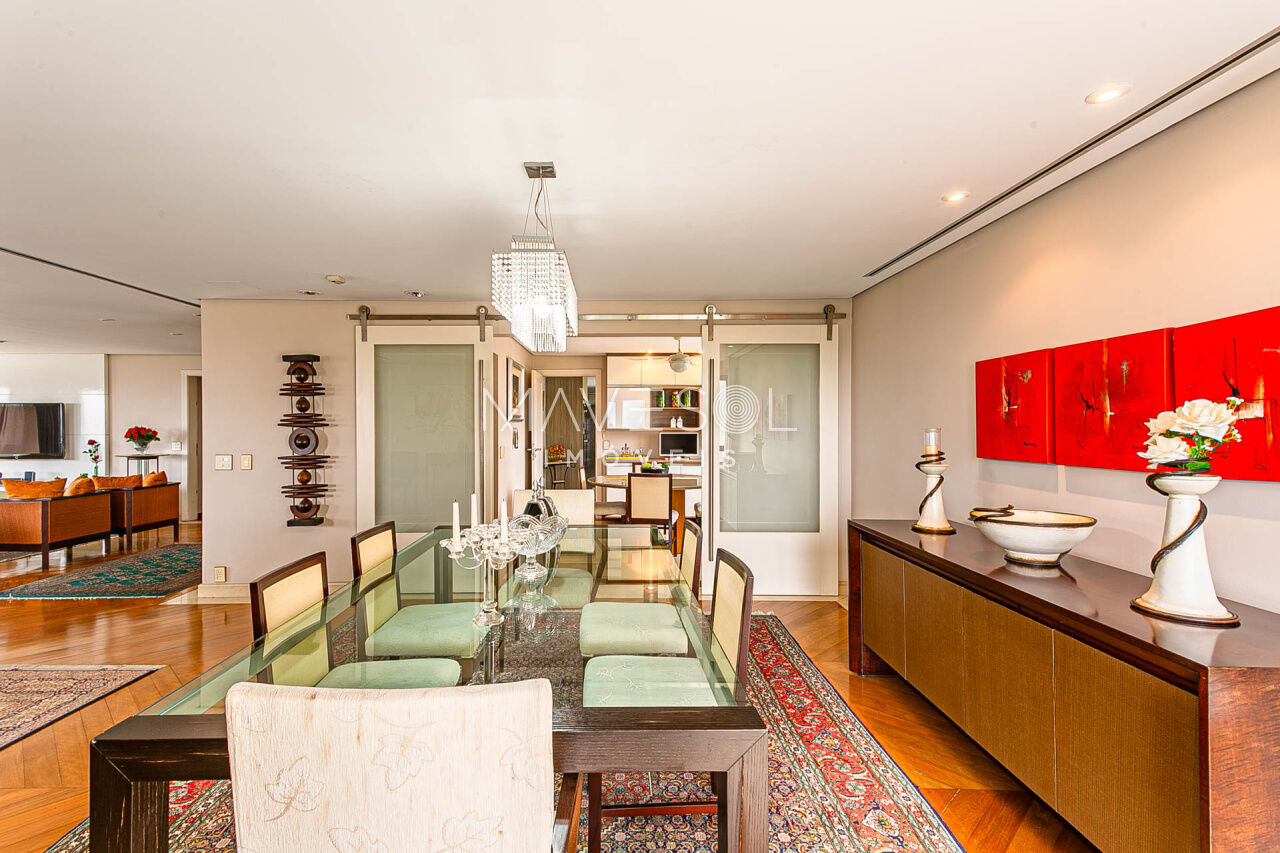 Alto padrão em prédio com arquitetura atemporal, amplo e muito iluminado com a melhor vista, excelente planta e distribuição em seus 390m2, varias salas, terraços espaçosos sendo 1 terraço gourmet com churrasqueira, sala de almoço cozinha planejada, dupla dependência para funcionários, suítes com terraço e suíte master com closet ele/ela super espaçosa.