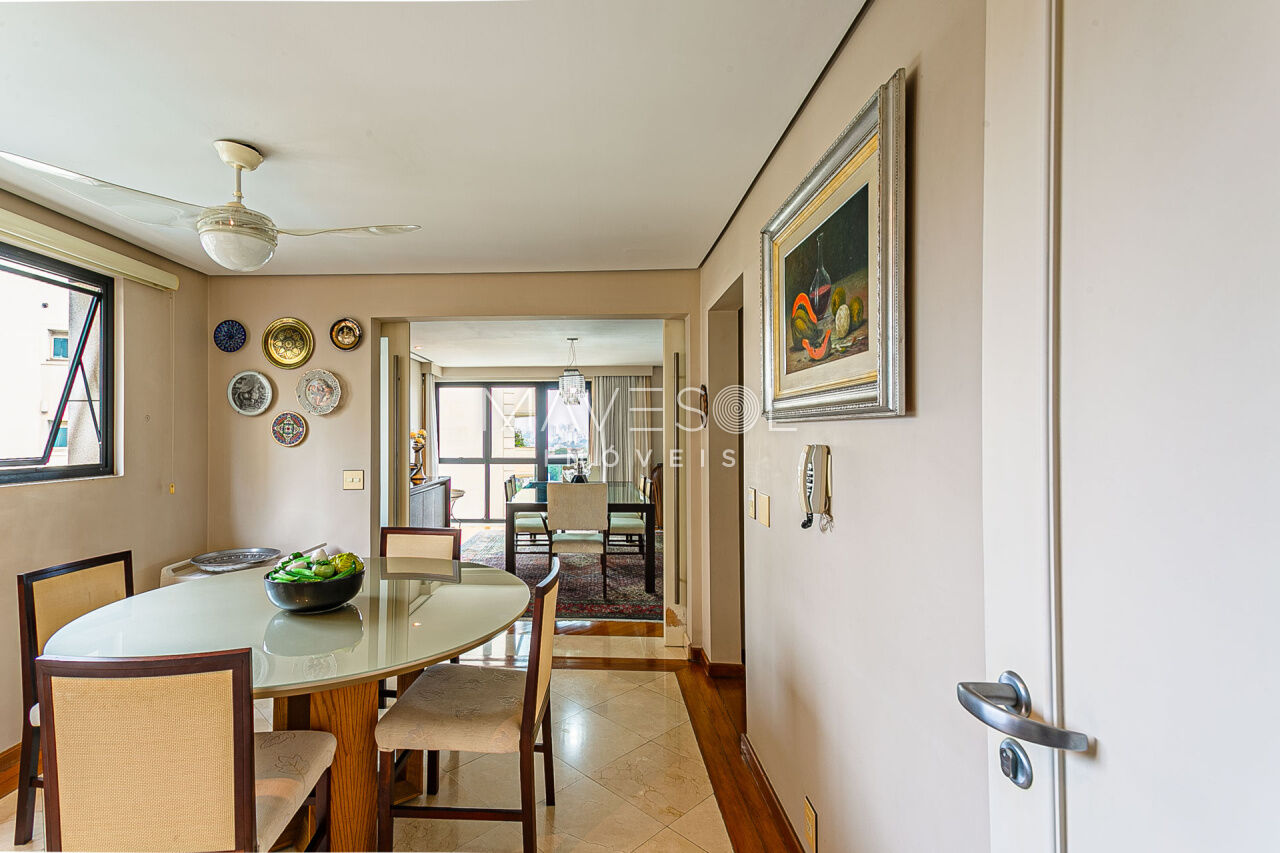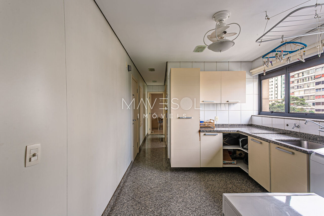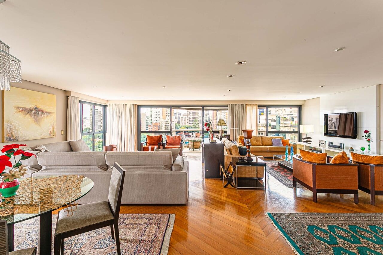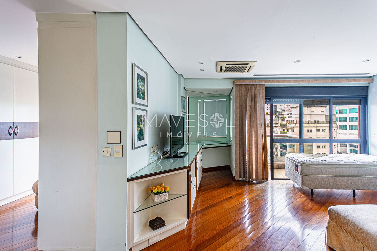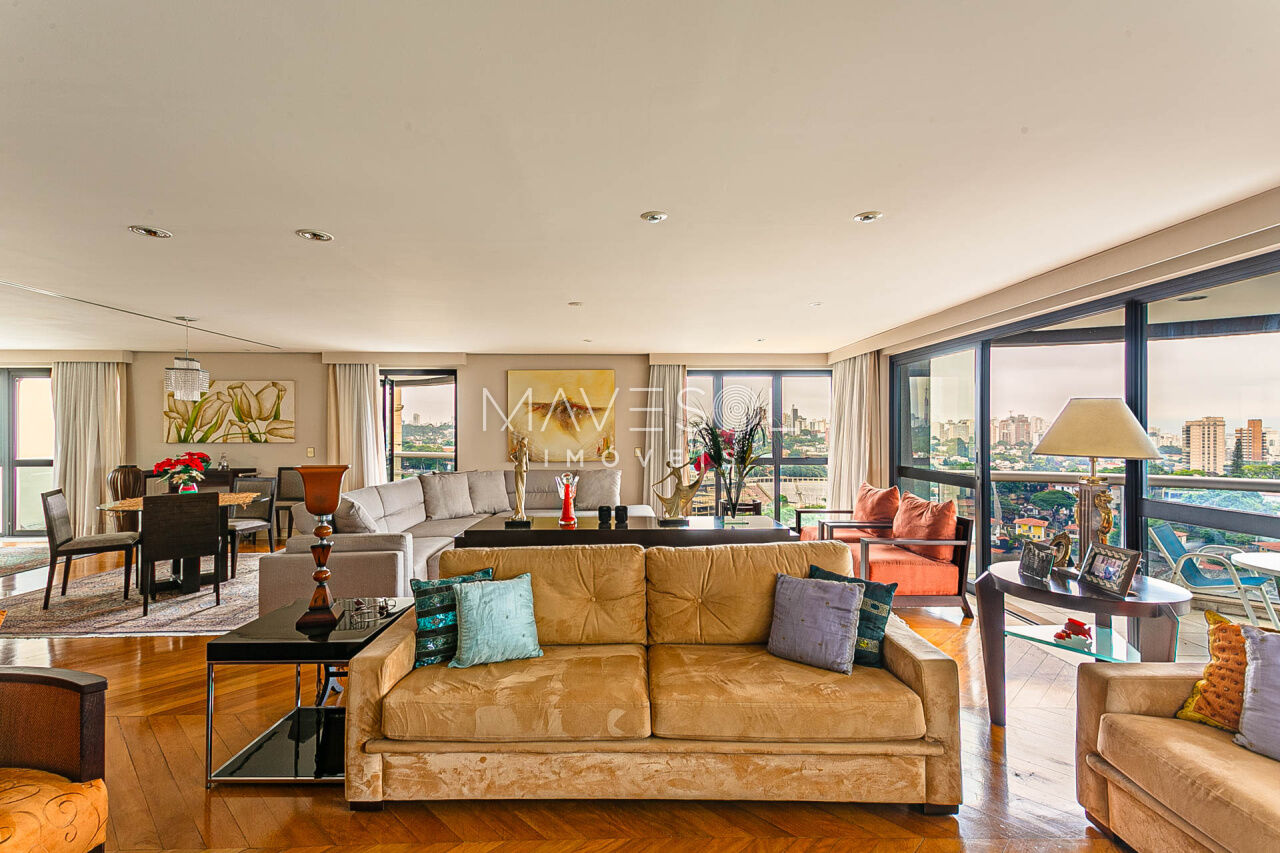 Alto padrão em prédio com arquitetura atemporal, amplo e muito iluminado com a melhor vista, excelente planta e distribuição em seus 390m2, varias salas, terraços espaçosos sendo 1 terraço gourmet com churrasqueira, sala de almoço cozinha planejada, dupla dependência para funcionários, suítes com terraço e suíte master com closet ele/ela super espaçosa.