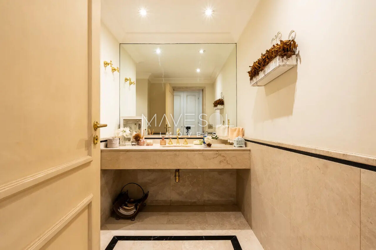 A sala de estar, com sua imponência, convida tanto a momentos de contemplação silenciosa quanto a recepções sofisticadas. O mármore, presente também nas passagens e detalhes do espaço, reforça a unidade estética e transforma cada ângulo em um convite à admiração. O hall, que conecta os ambientes sociais, é mais do que uma área de circulação: é um espaço de transição que dá continuidade à narrativa do imóvel, mantendo a mesma atmosfera refinada.