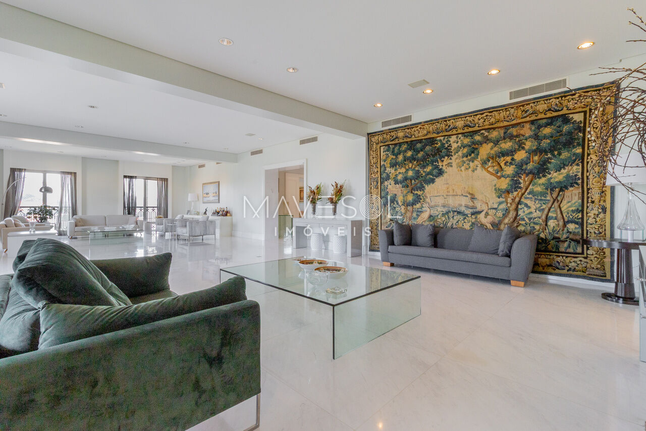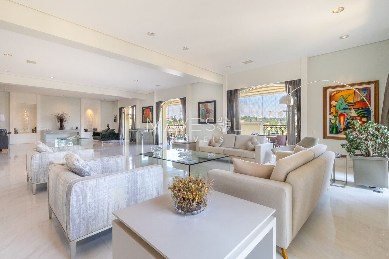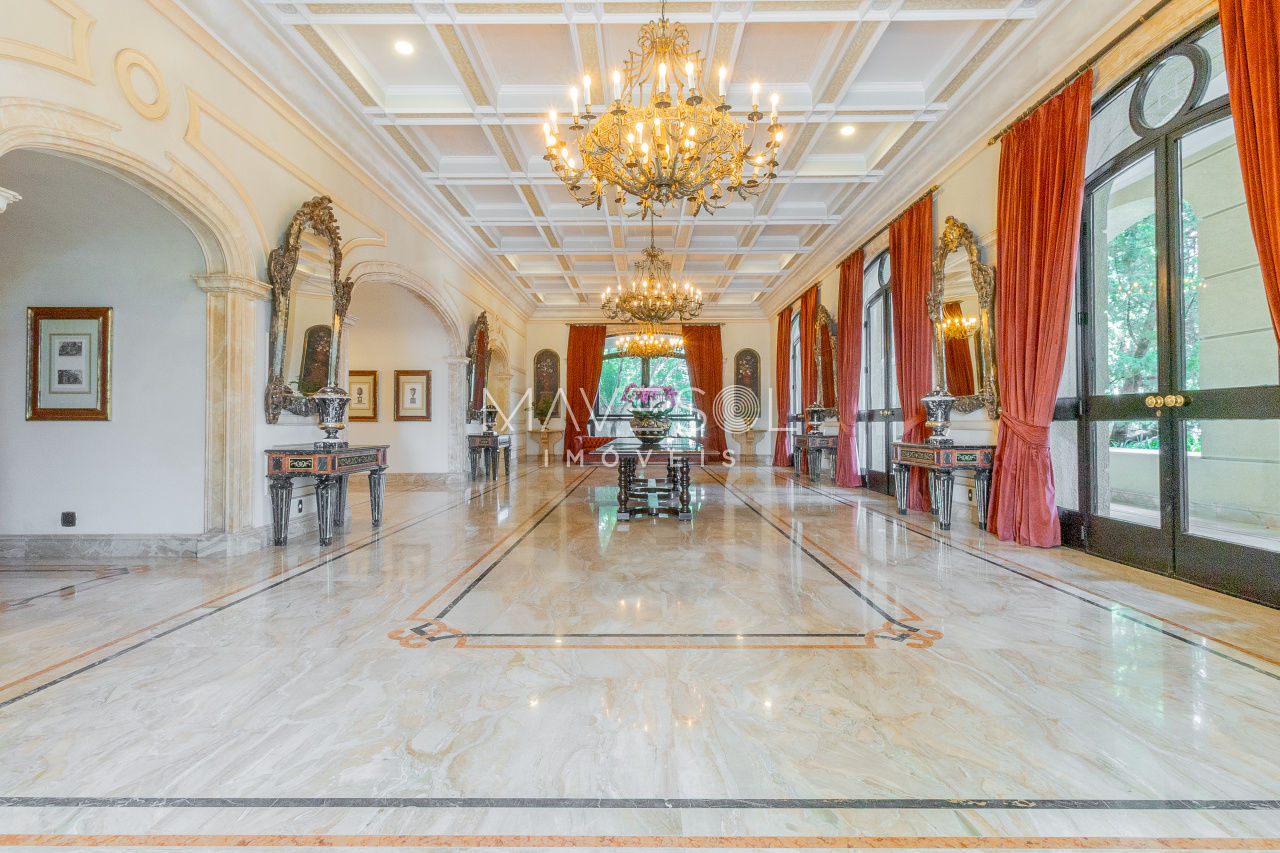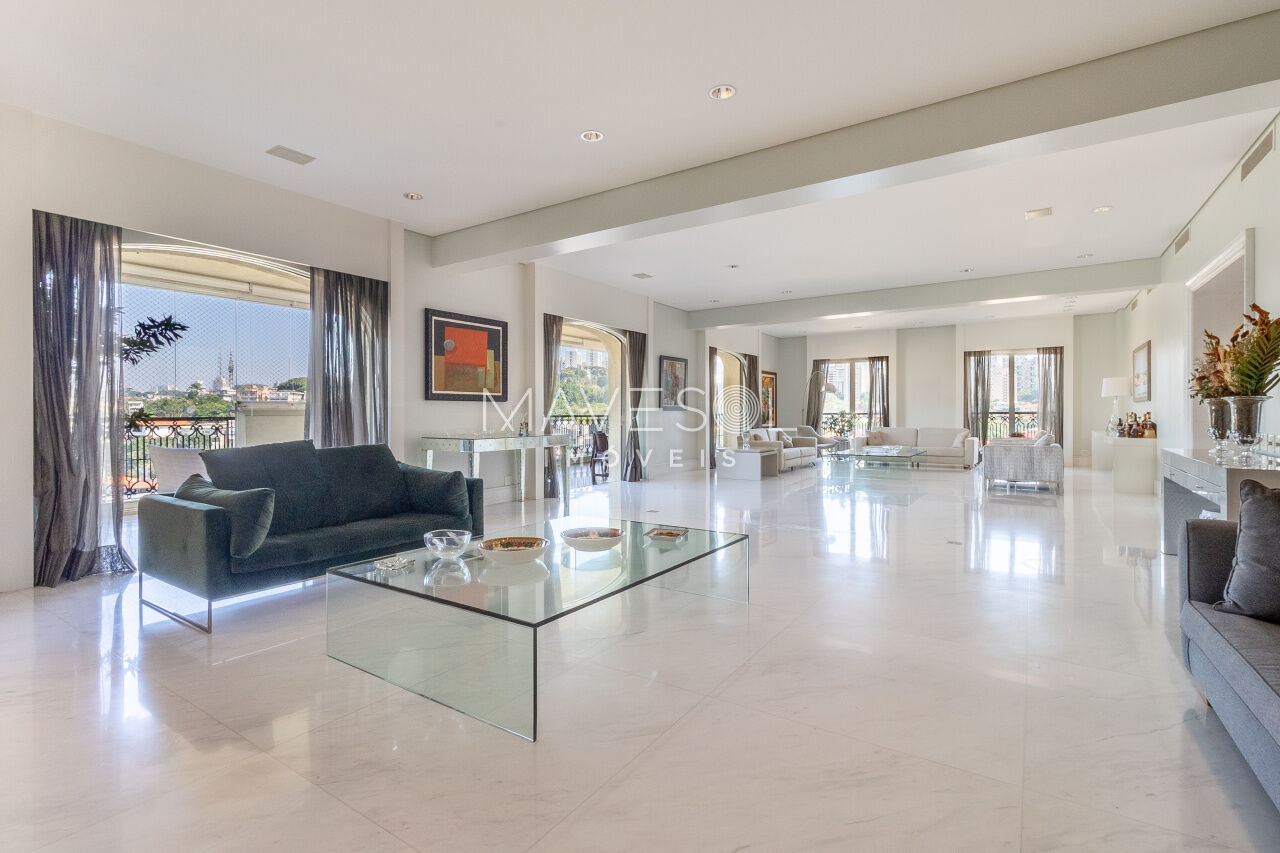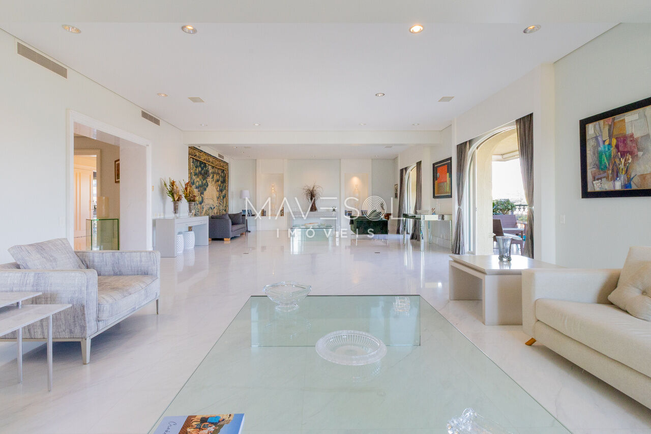 O hall de entrada é suntuoso e já antecipa a grandiosidade do apartamento. O living é simplesmente monumental, com múltiplos ambientes integrados, varanda de proporções generosas e uma vista deslumbrante e permanente para o Vale do Pacaembu, trazendo uma sensação constante de amplitude e conexão com o verde.