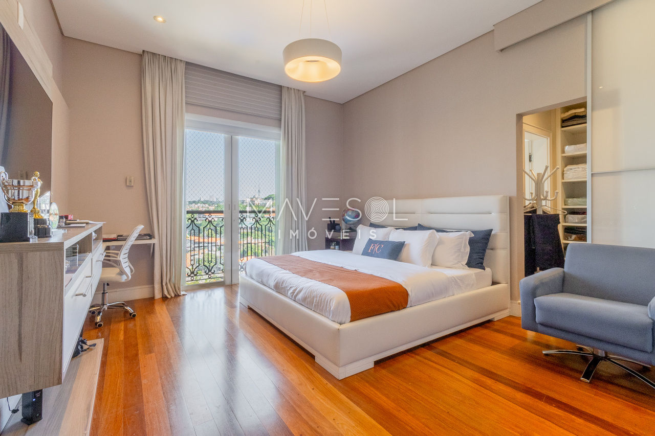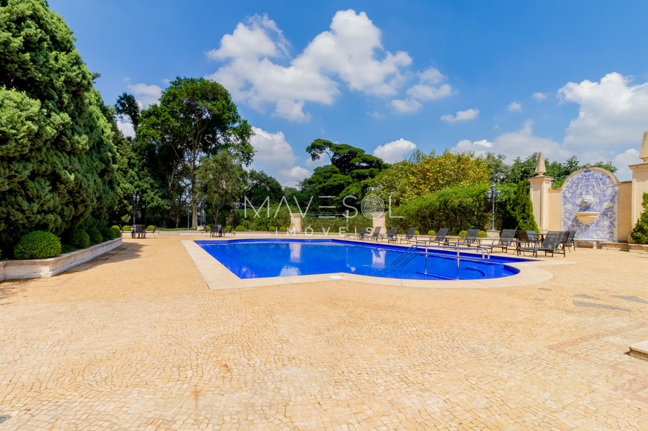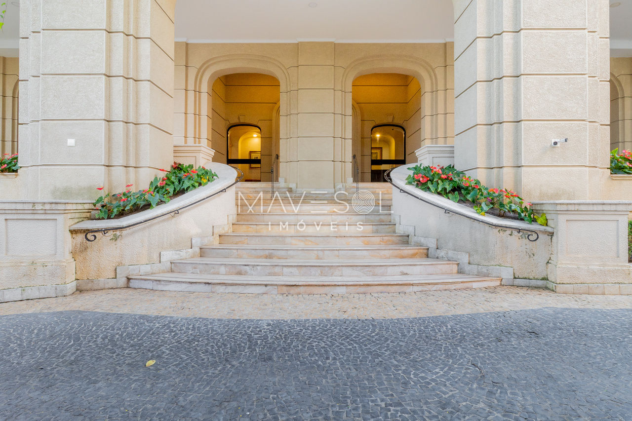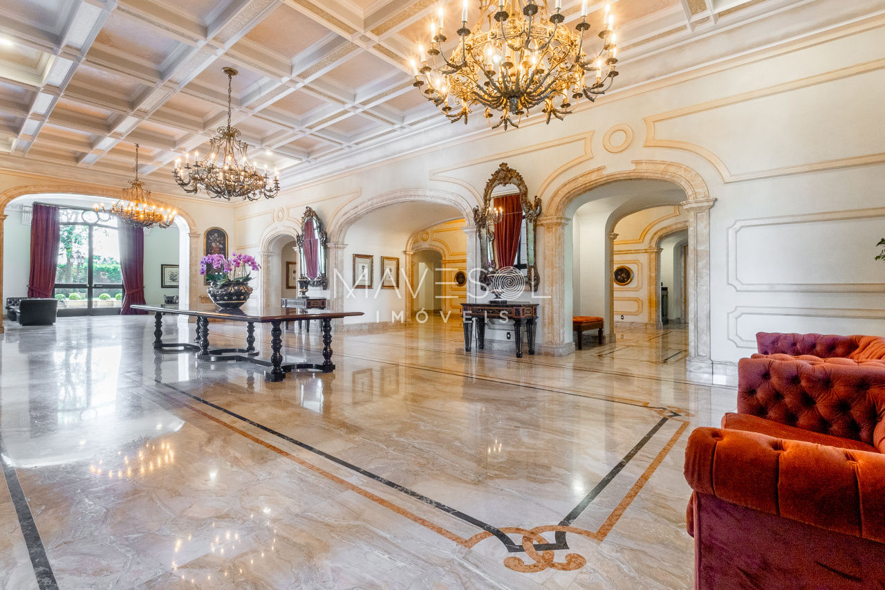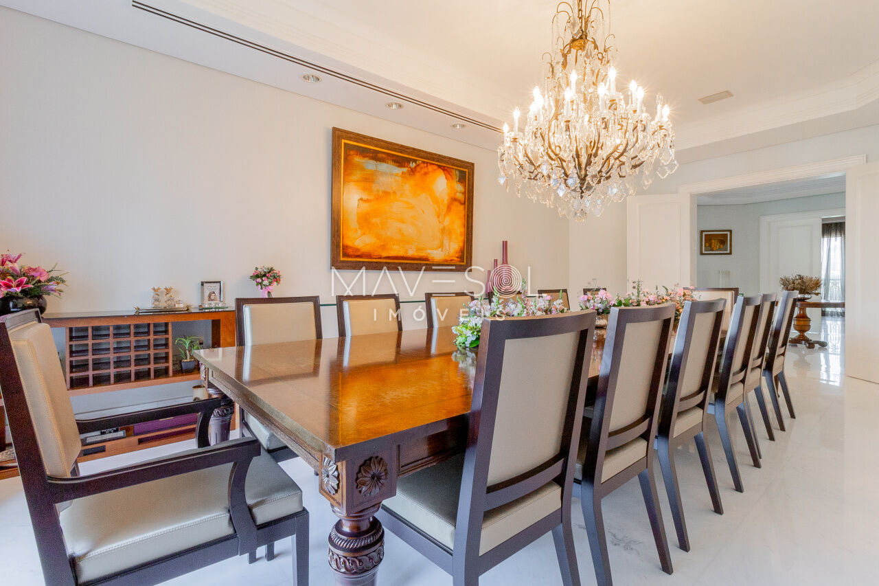 O hall de entrada é suntuoso e já antecipa a grandiosidade do apartamento. O living é simplesmente monumental, com múltiplos ambientes integrados, varanda de proporções generosas e uma vista deslumbrante e permanente para o Vale do Pacaembu, trazendo uma sensação constante de amplitude e conexão com o verde.