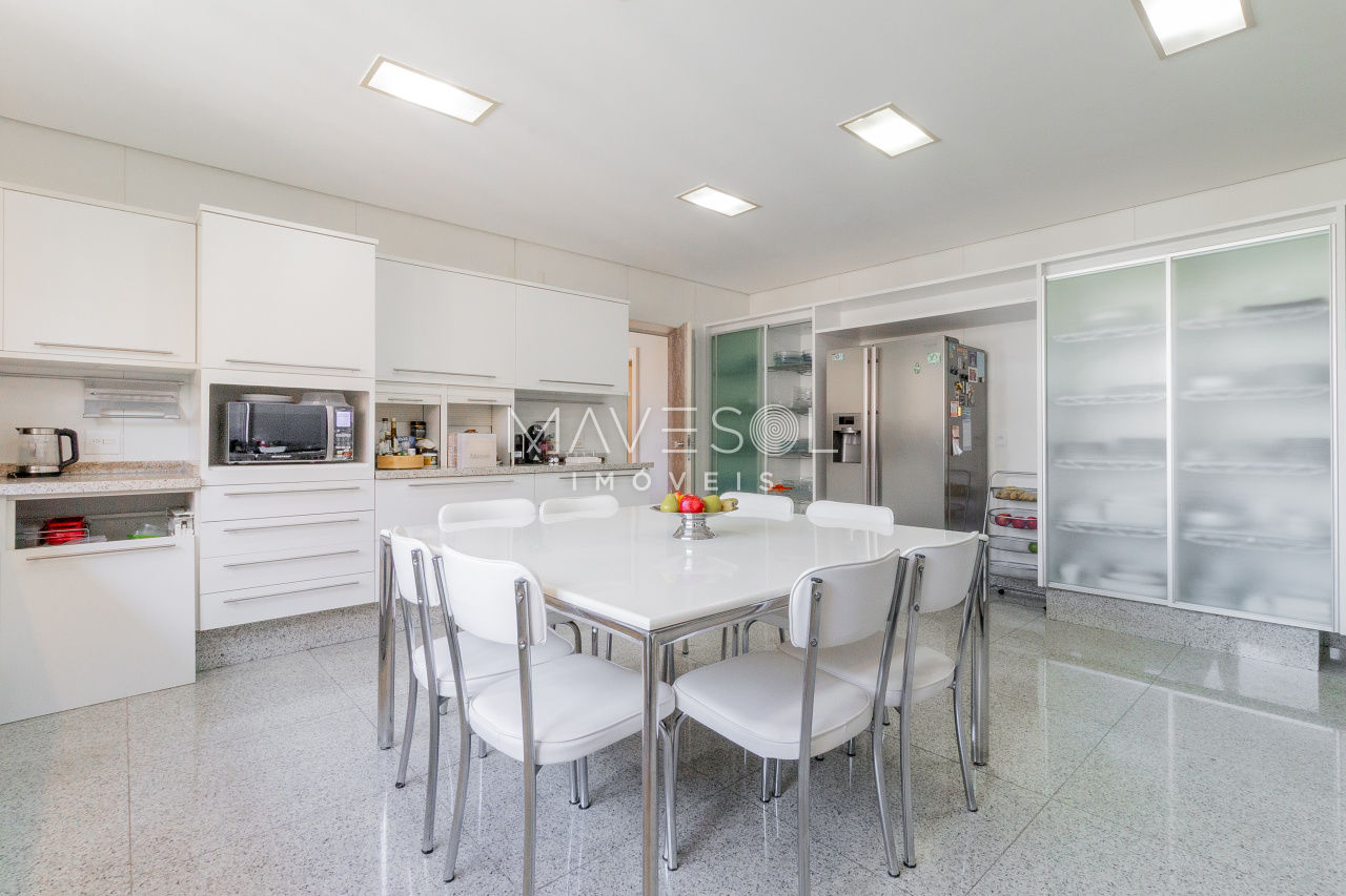 A cozinha, assinada pela Kitchens, é ampla, funcional e extremamente bem equipada, com marcenaria de alto padrão, além de contar com despensa e cristaleira, reforçando o cuidado com cada detalhe do projeto.