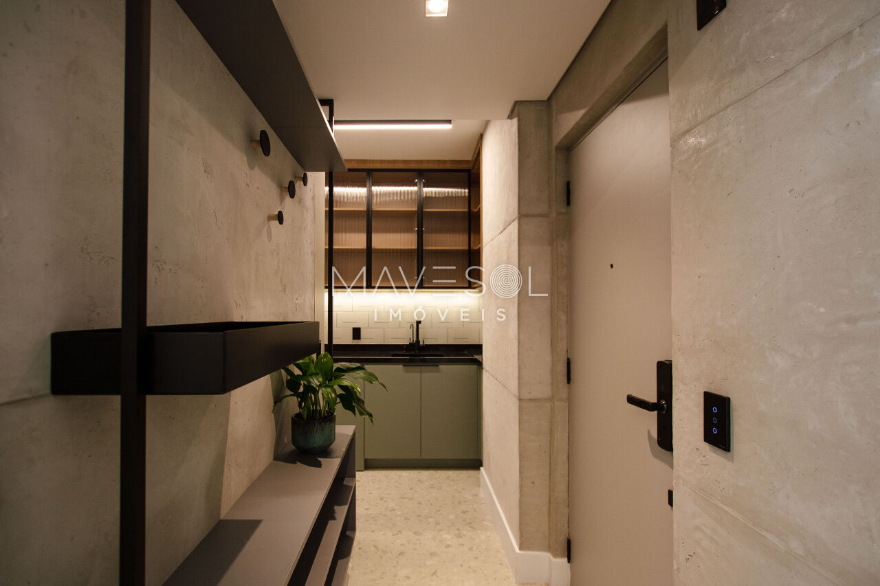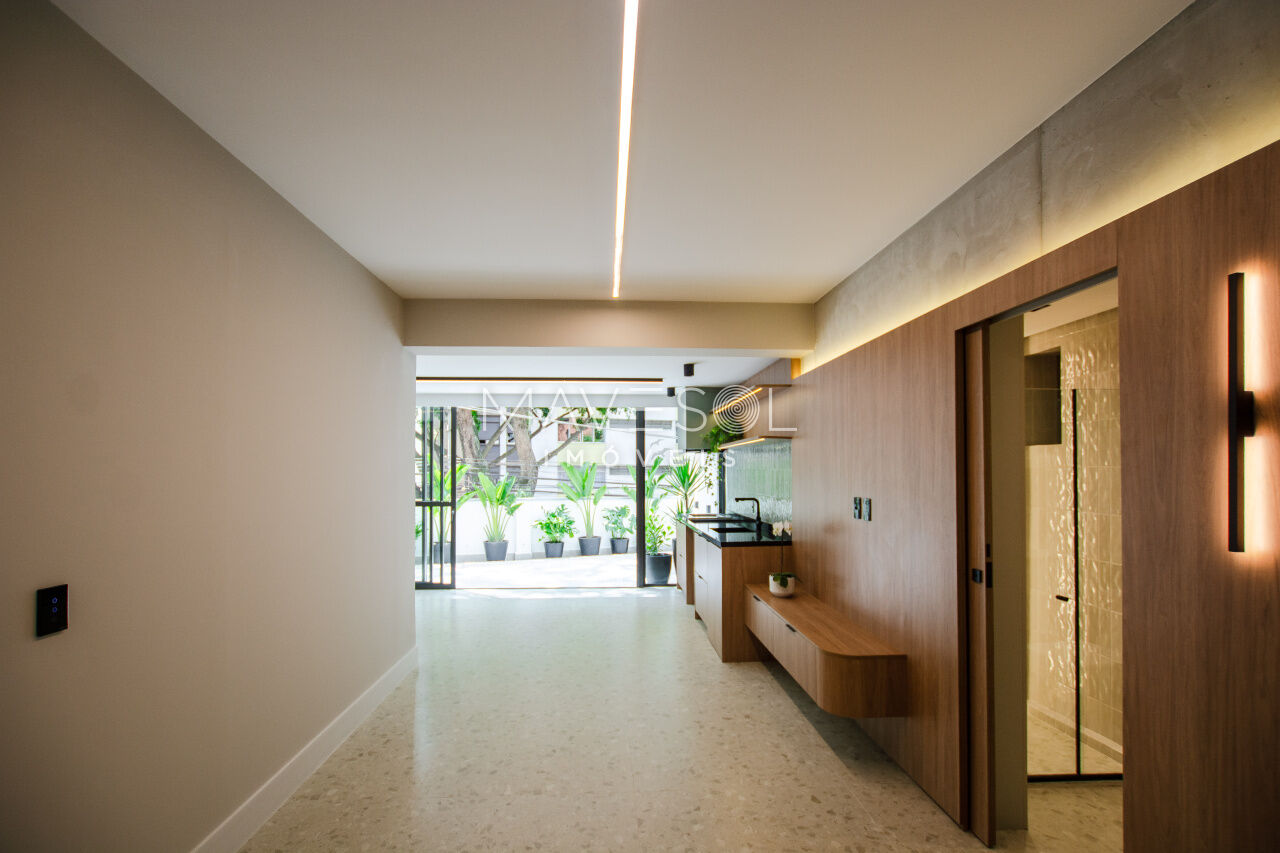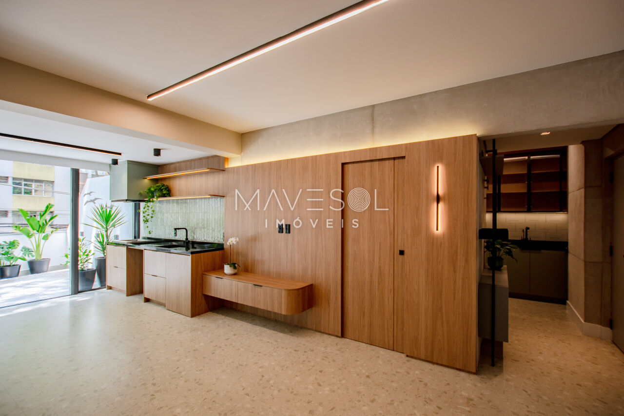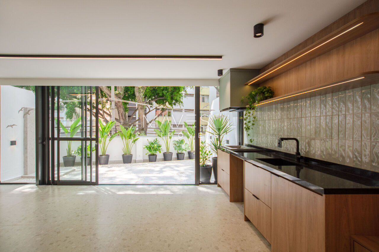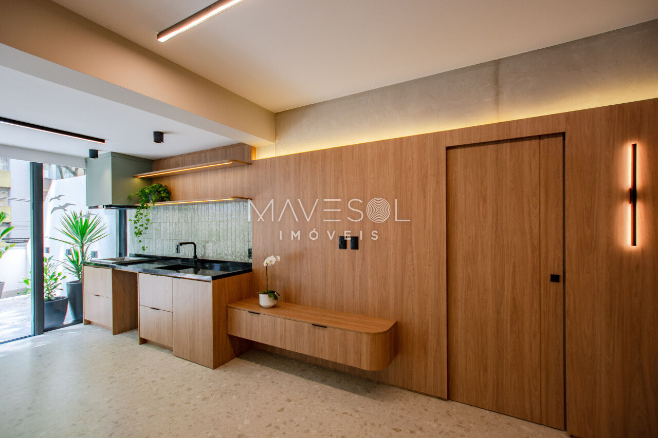 1 dorm, living amplo, cozinha planejada, área gourmet com churrasqueira e quintal com chuverão e sistema de irrigação para plantas.