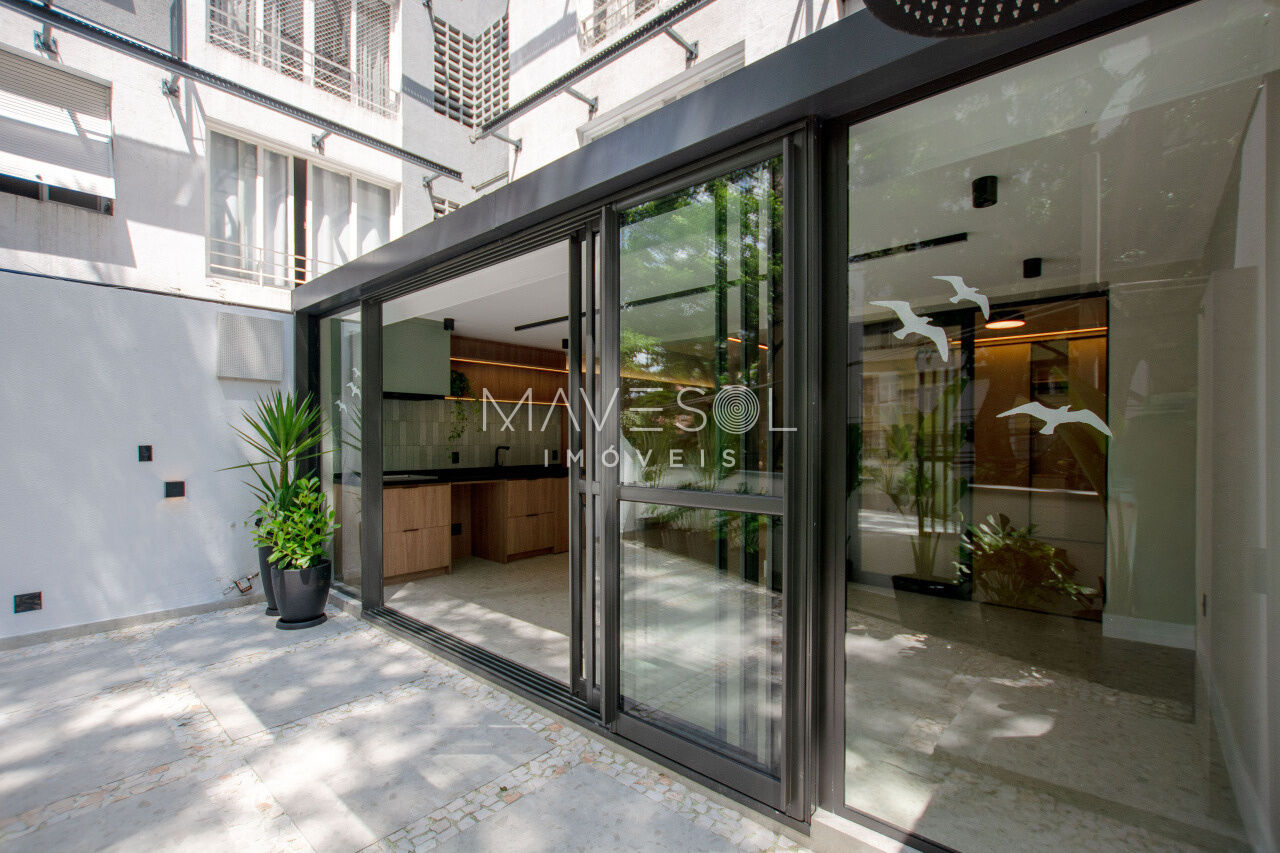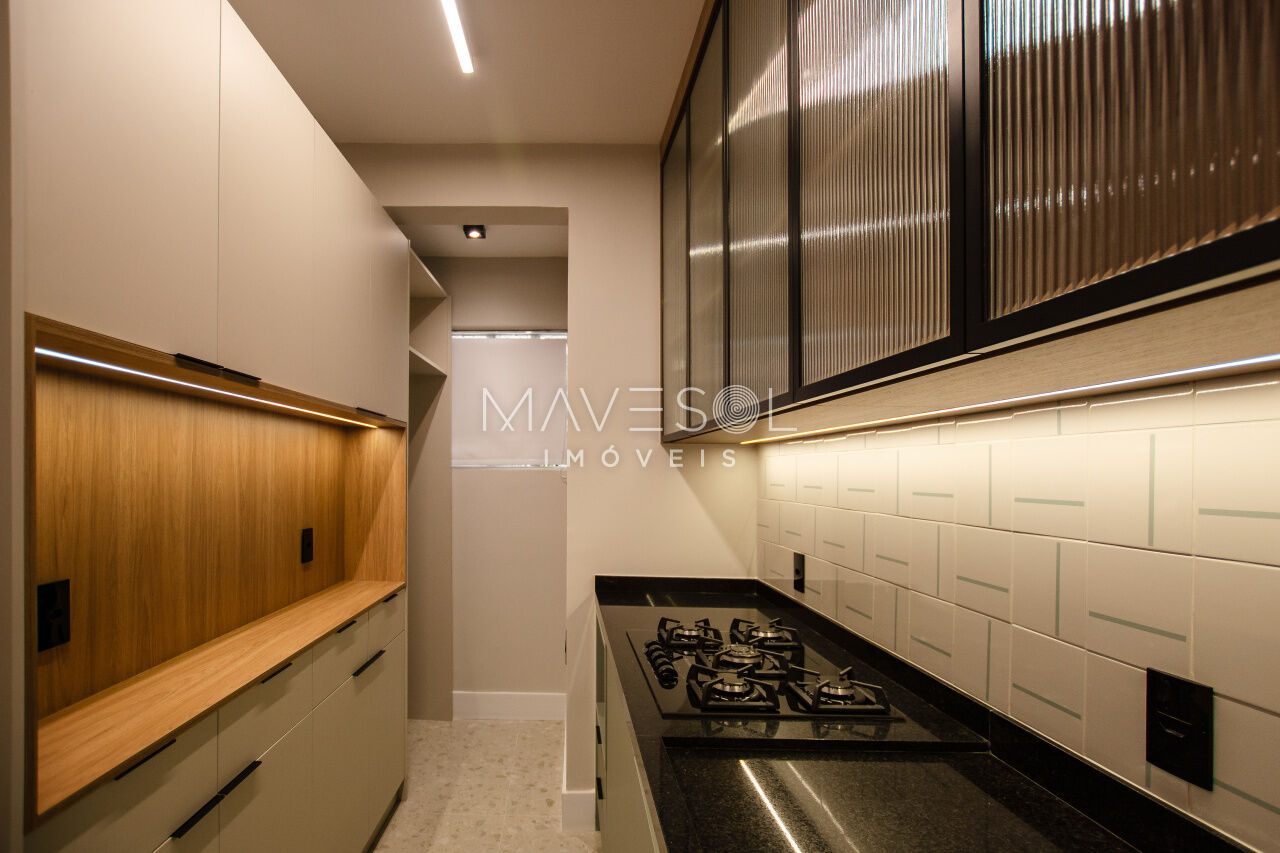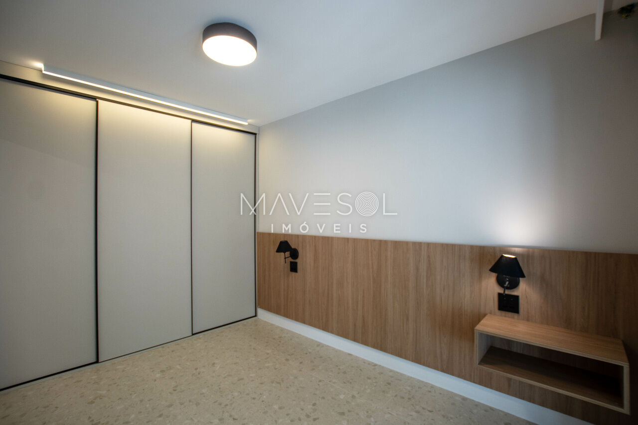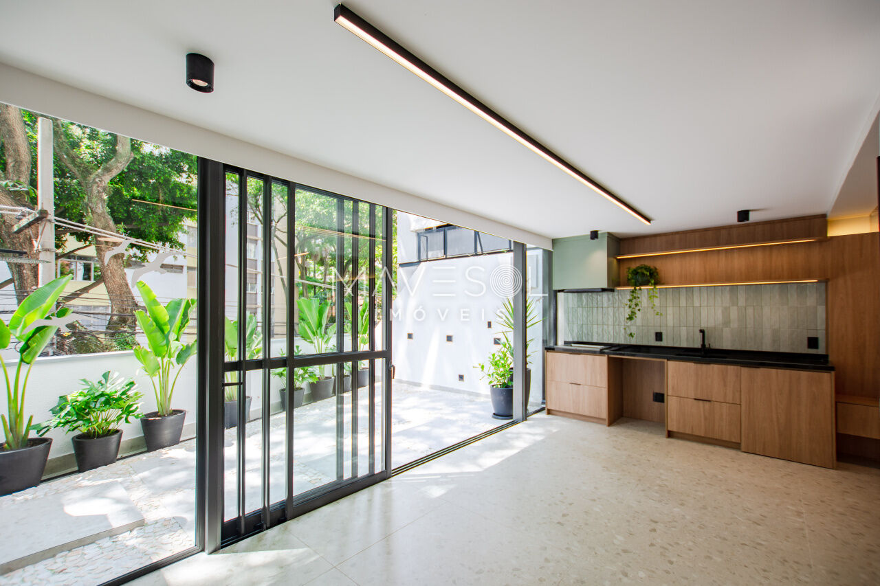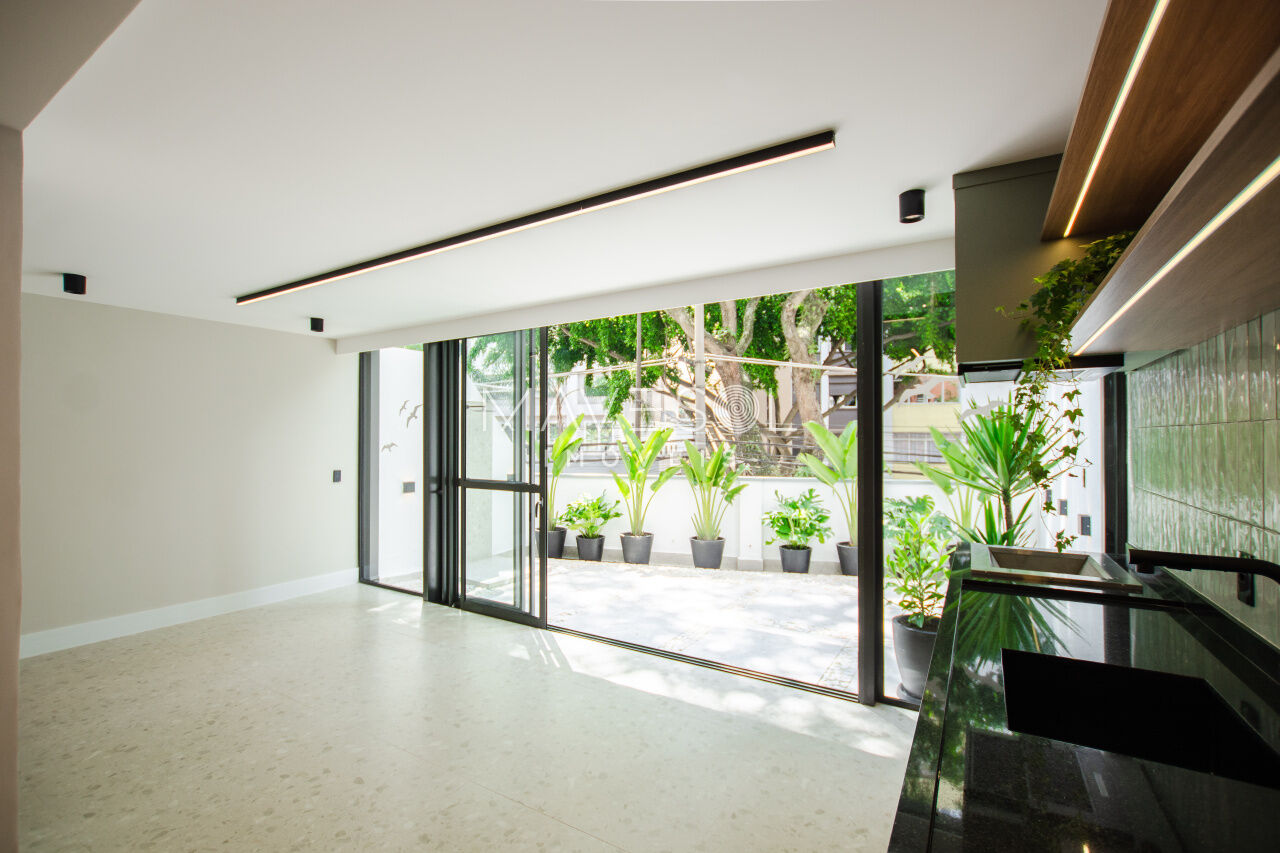 1 dorm, living amplo, cozinha planejada, área gourmet com churrasqueira e quintal com chuverão e sistema de irrigação para plantas.