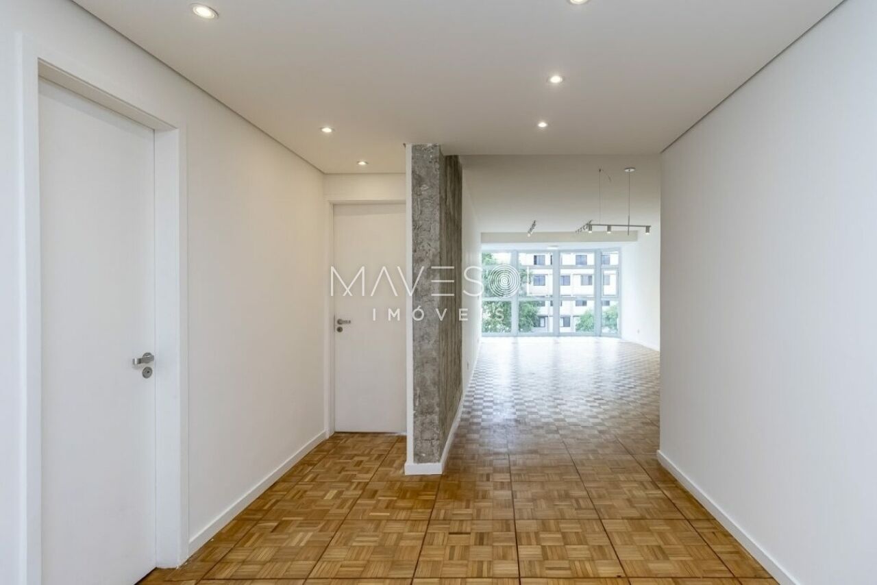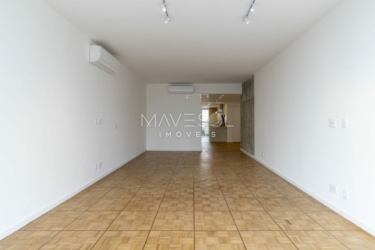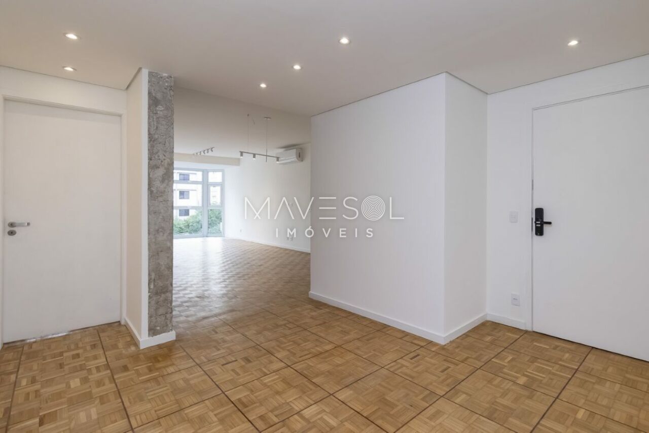 Esse apto de 141 m² tem aquela combinação rara que inclui muita luz natural, vista incrível, e um projeto muito bem resolvido. A sala ampla, com seu janelão do chão ao teto, deixa a claridade preencher cada canto e realça o charme do piso em mini parquet, que aquece o ambiente. O pilar em concreto aparente traz textura ao espaço social.