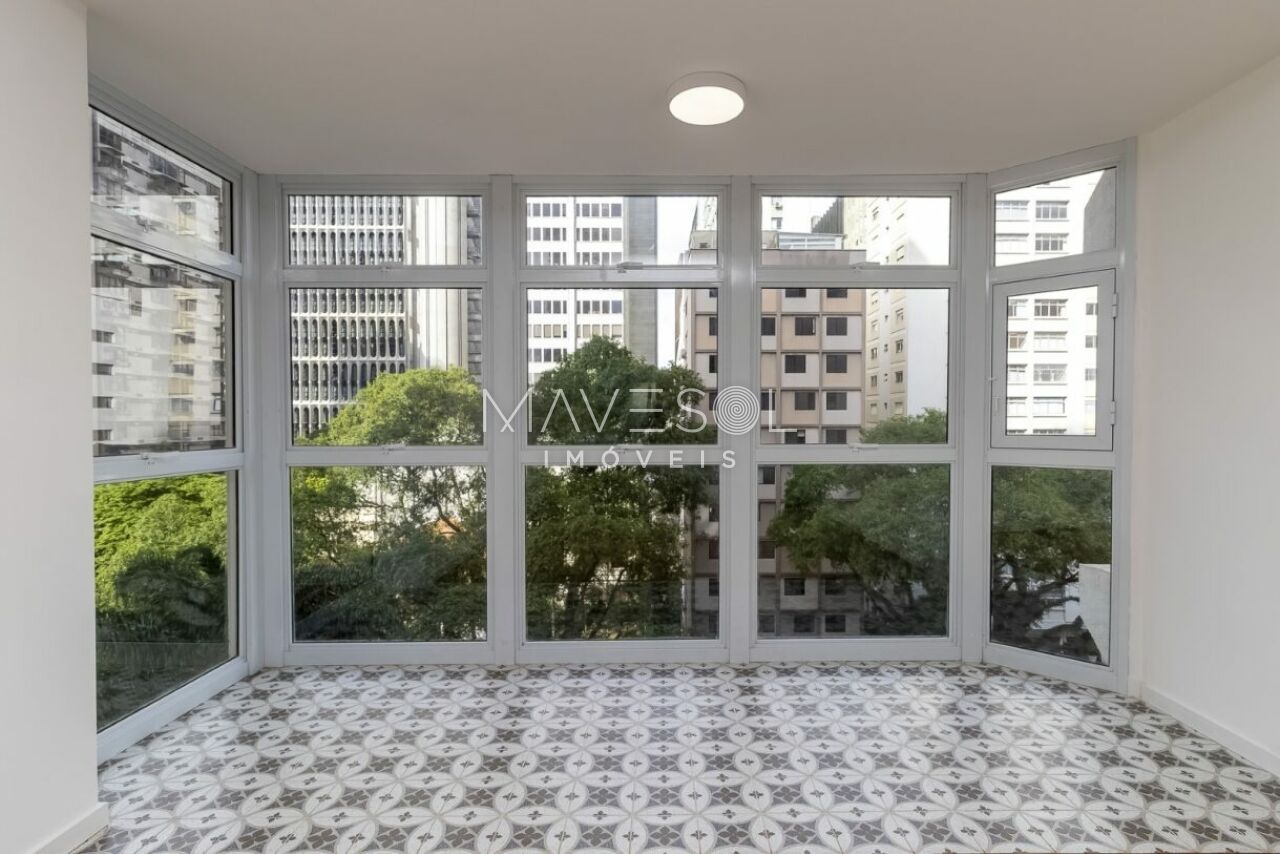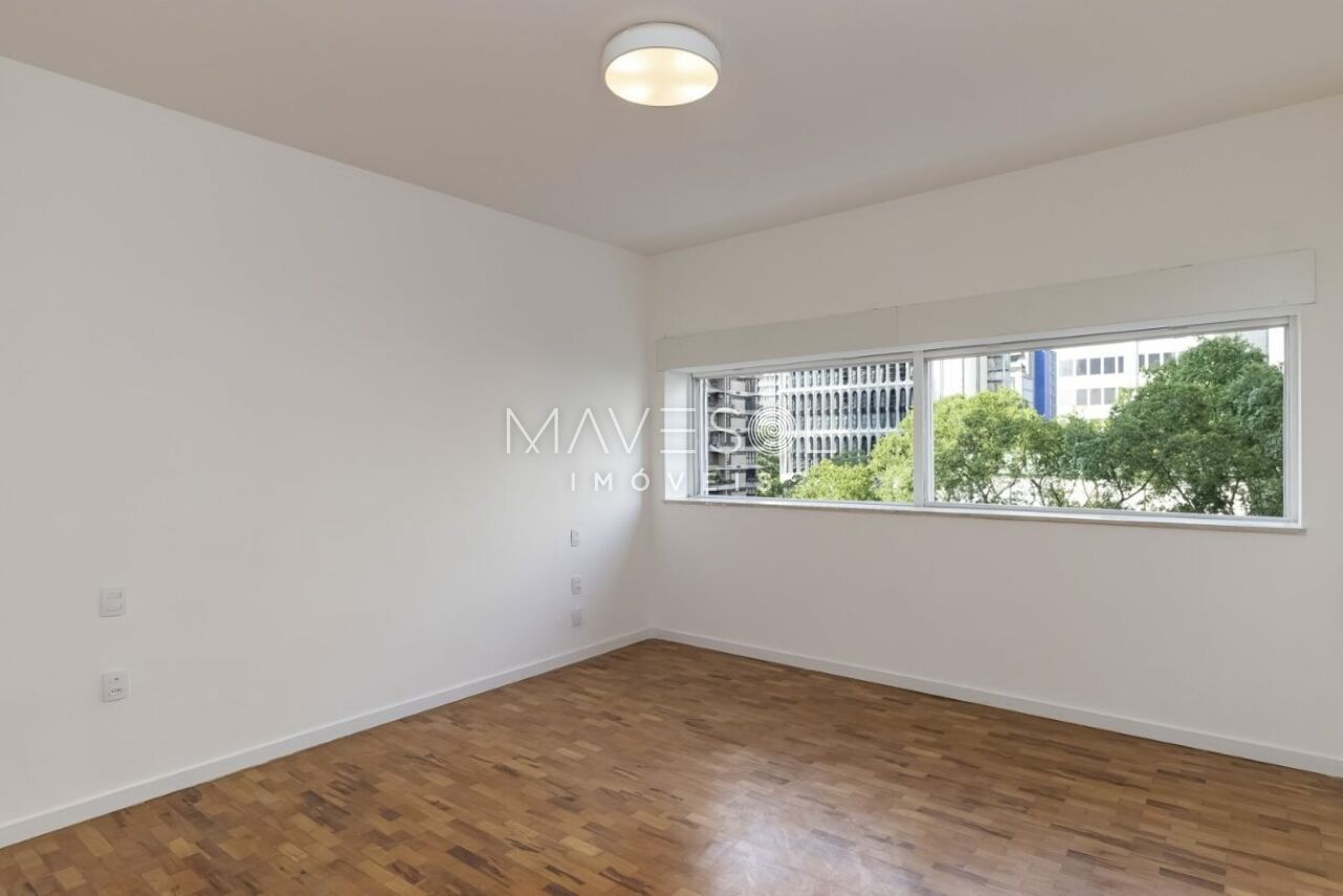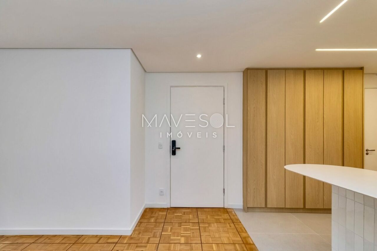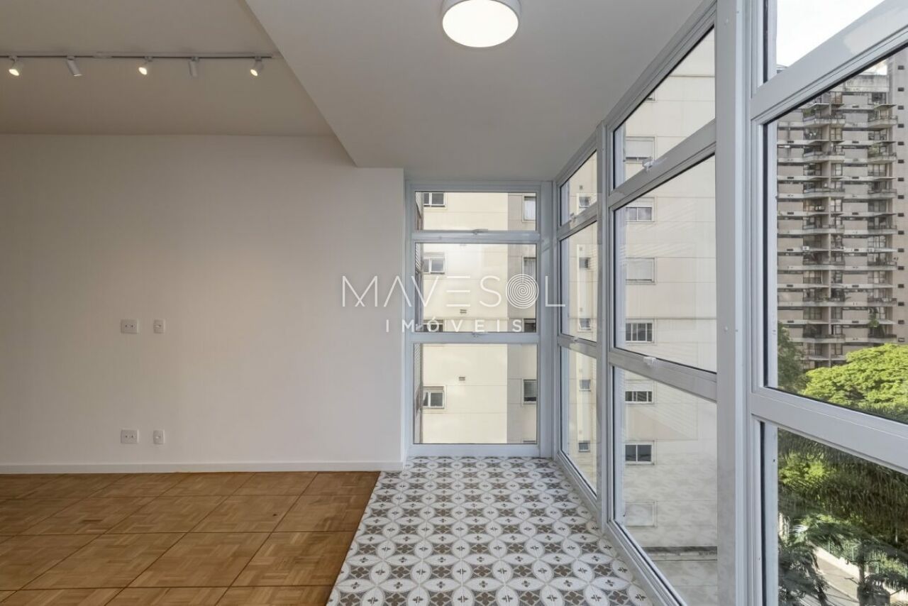 Esse apto de 141 m² tem aquela combinação rara que inclui muita luz natural, vista incrível, e um projeto muito bem resolvido. A sala ampla, com seu janelão do chão ao teto, deixa a claridade preencher cada canto e realça o charme do piso em mini parquet, que aquece o ambiente. O pilar em concreto aparente traz textura ao espaço social.