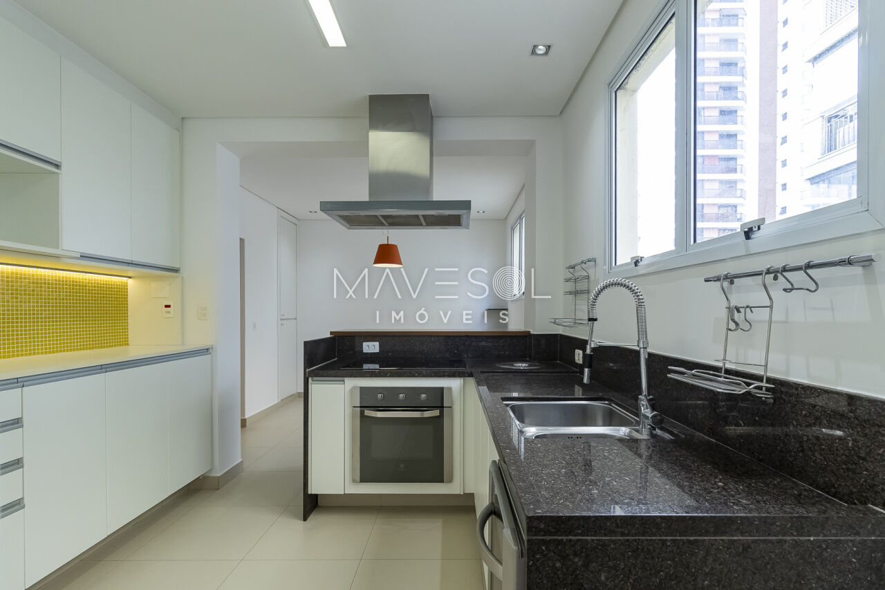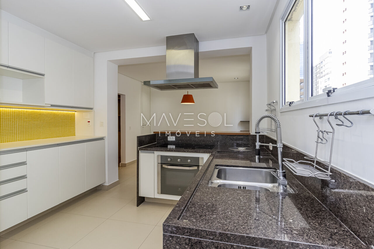 Vem com cooktop, coifa, forno, aquecedor a gás e muitos armários.