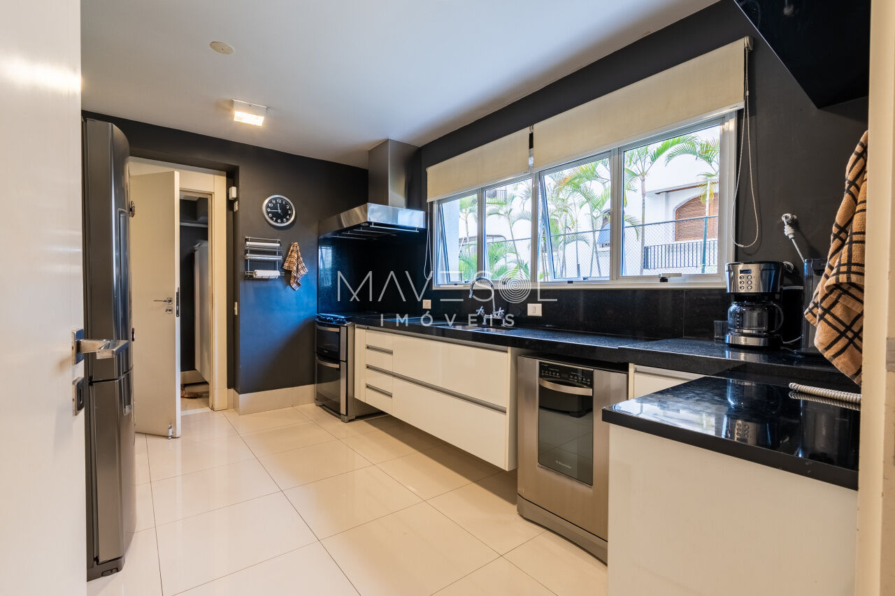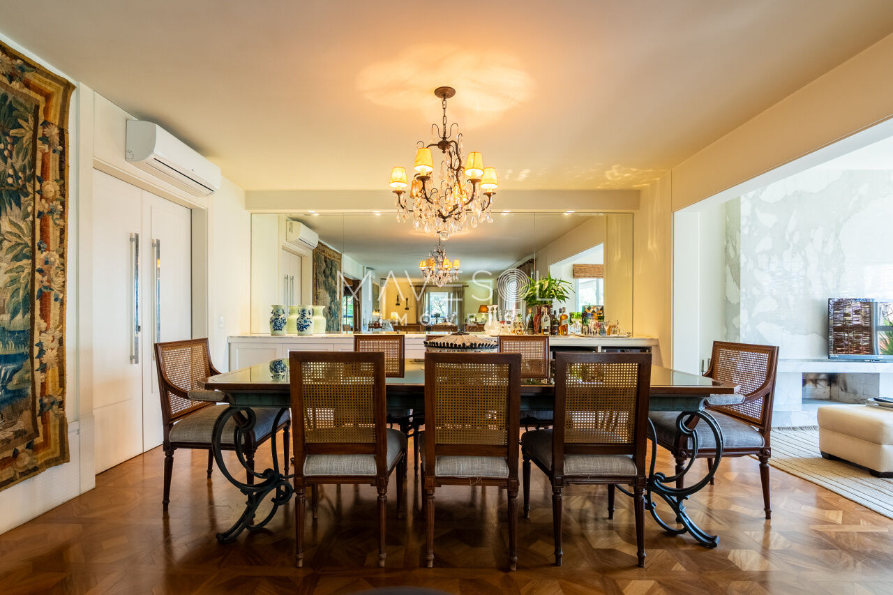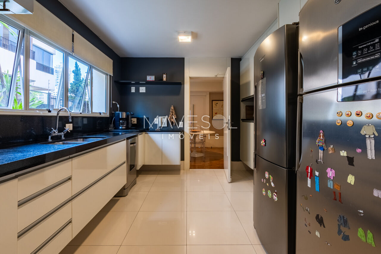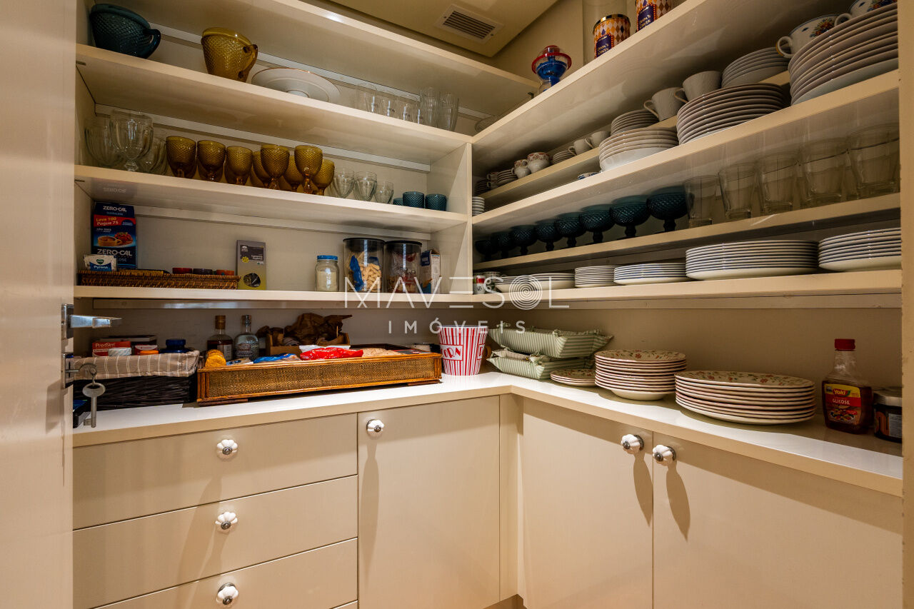 A área de serviço do apartamento é igualmente bem resolvida, com copa, cozinha e lavanderia perfeitamente setorizadas. A copa, charmosa e funcional, conta com porta de abrir que pode permanecer totalmente aberta, criando uma conexão harmoniosa com a sala de jantar, ideal para momentos de receber a família e os amigos com conforto e sofisticação. O imóvel ainda oferece dois dormitórios e um banheiro de serviço, além de cinco vagas de garagem, agregando comodidade e exclusividade ao conjunto.