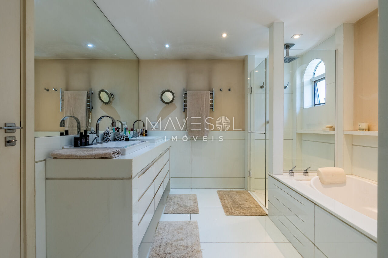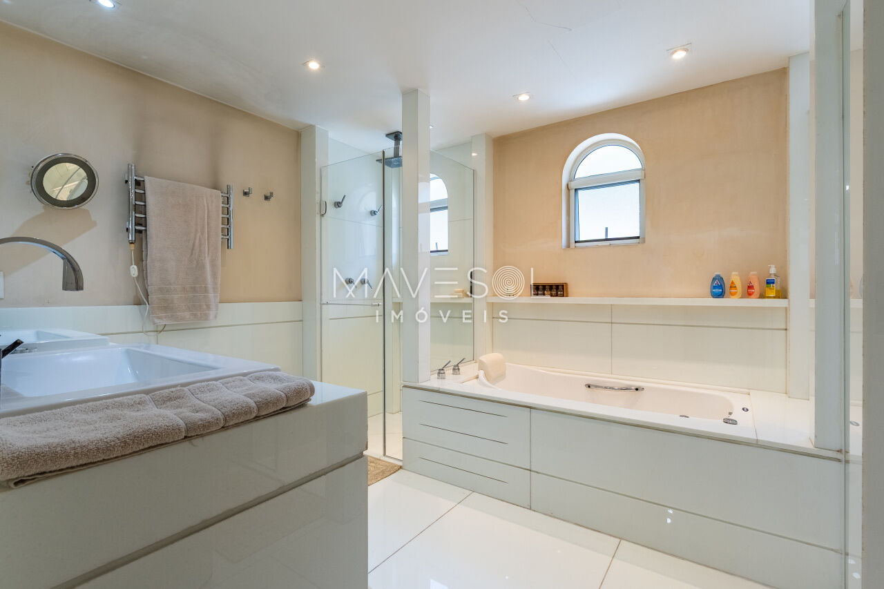 A área íntima foi cuidadosamente planejada para proporcionar máximo conforto e privacidade, com três suítes impecáveis, cada uma com excelente iluminação natural e acabamentos sofisticados. A suíte master é um verdadeiro refúgio, destacando-se por um amplo closet, quase do tamanho do quarto, e um banheiro elegante, equipado com banheira e duas duchas independentes, oferecendo um ambiente de puro relaxamento.