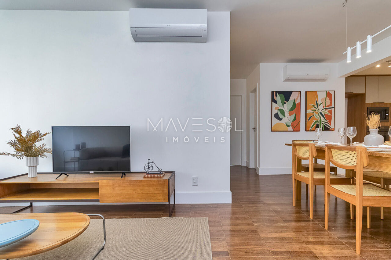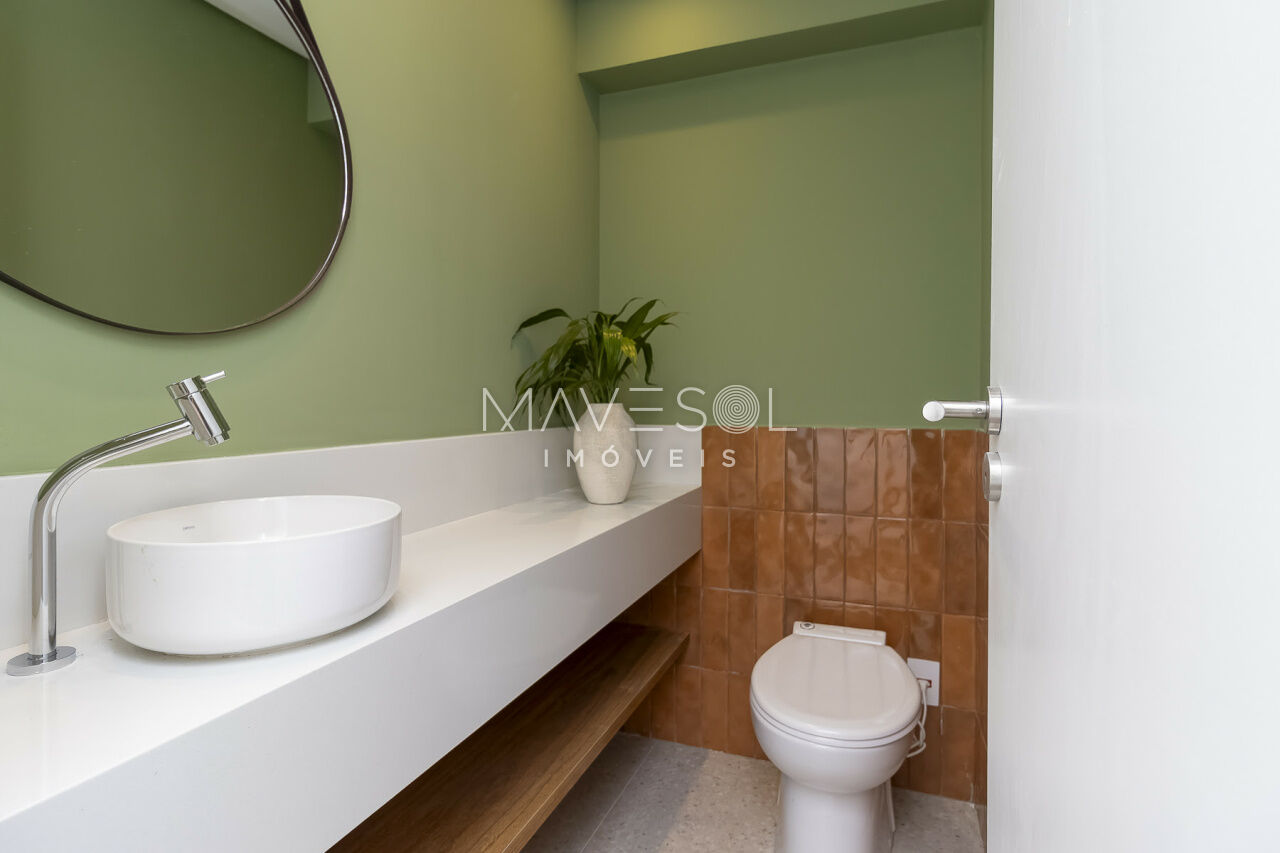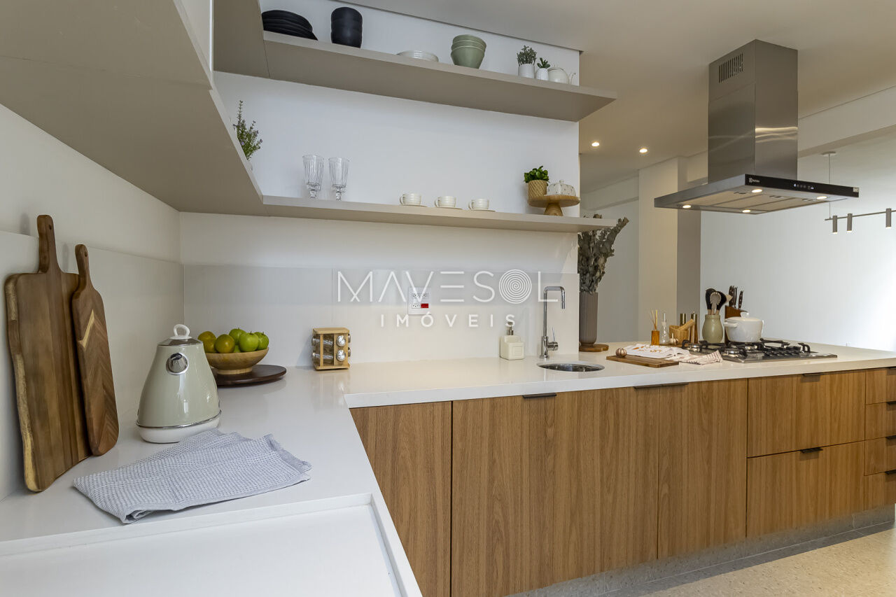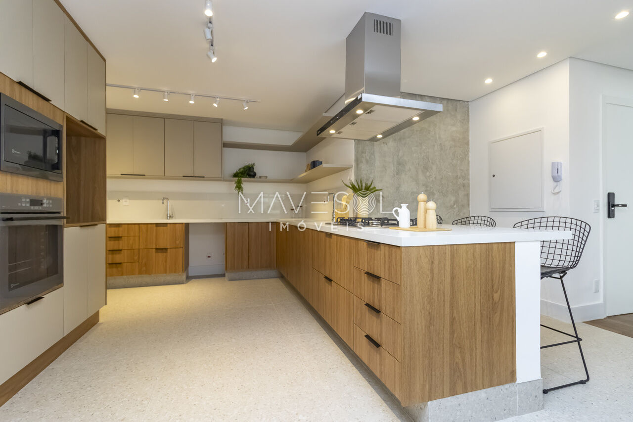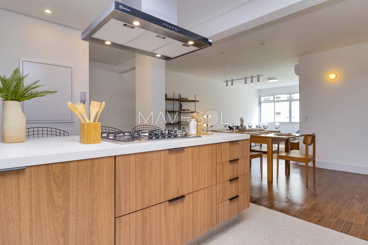 O piso da sala, no tradicional tacão de madeira Sucupira, foi finamente restaurado. O projeto é complementado por acabamentos de alto padrão, marcenaria sob medida na cozinha, área de serviço e banheiros, além de eletrodomésticos instalados (cooktop, coifa, forno elétrico) e aquecedor a gás.
