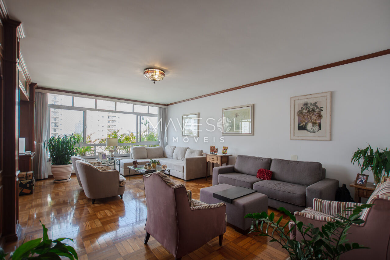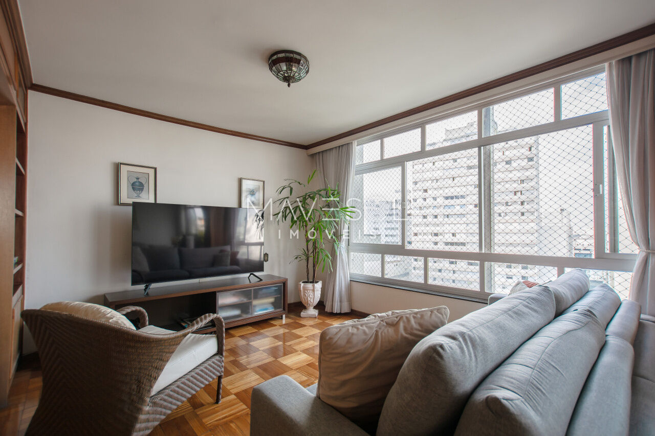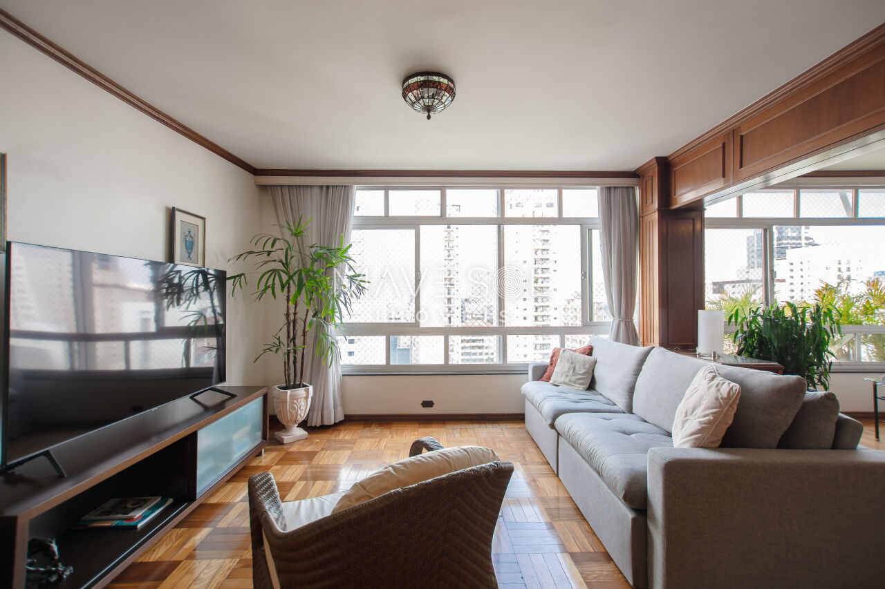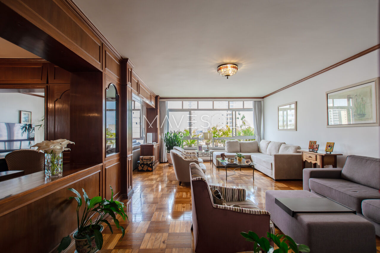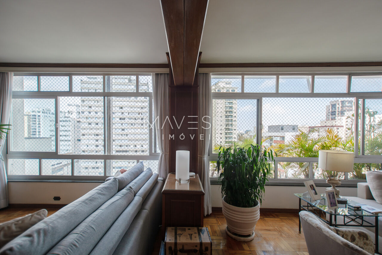 Apartamento amplo e ensolarado com vista linda para o skyline paulista, em localização privilegiada, próximo de todas as facilidades do bairro, padarias, cafés, praças, restaurantes e do Shopping Higienópolis. O living espaçoso com janelões de parede a parede acomoda três ambientes de forma confortável, incluindo sala de jantar, sala de TV e lavabo. A copa-cozinha é funcional e bem planejada. A planta original possui três dormitórios, sendo uma suíte mais sala intima, com a reforma, tem o quarto dormitório, que originalmente é o quarto de empregada, também conta com dois banheiros, todos com armários .