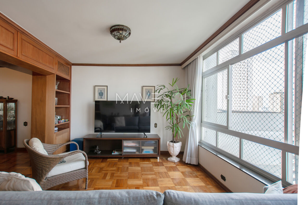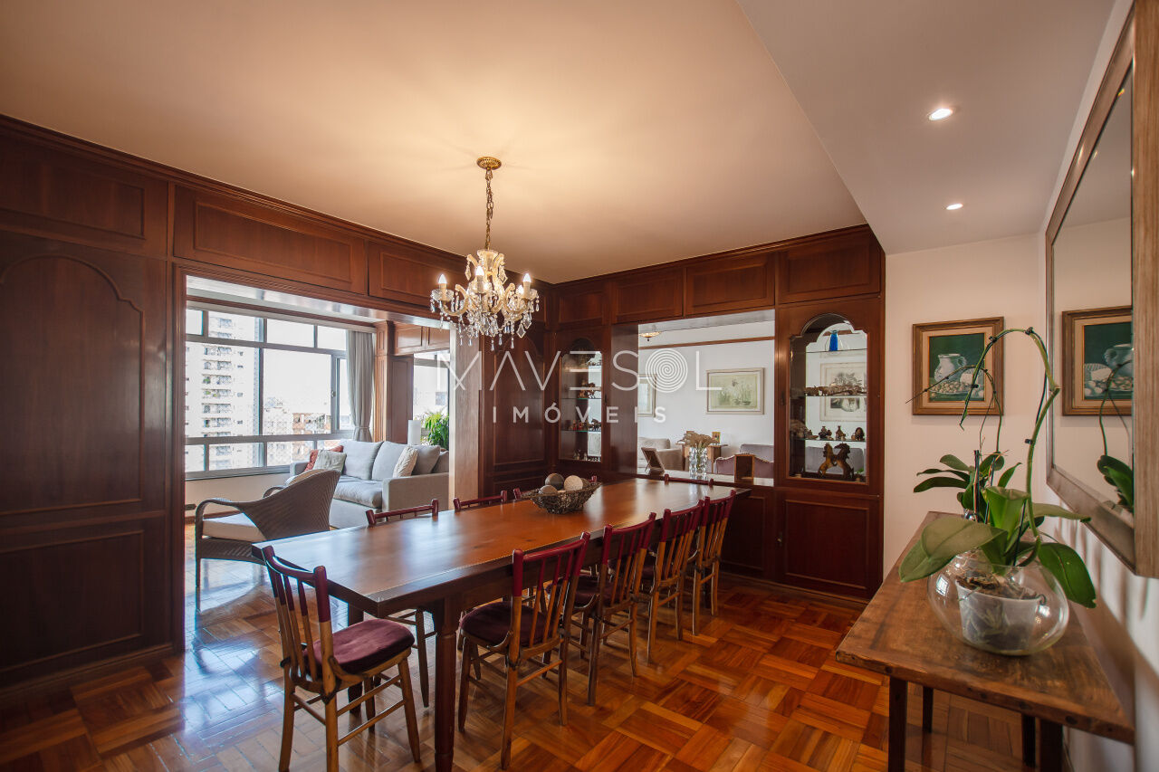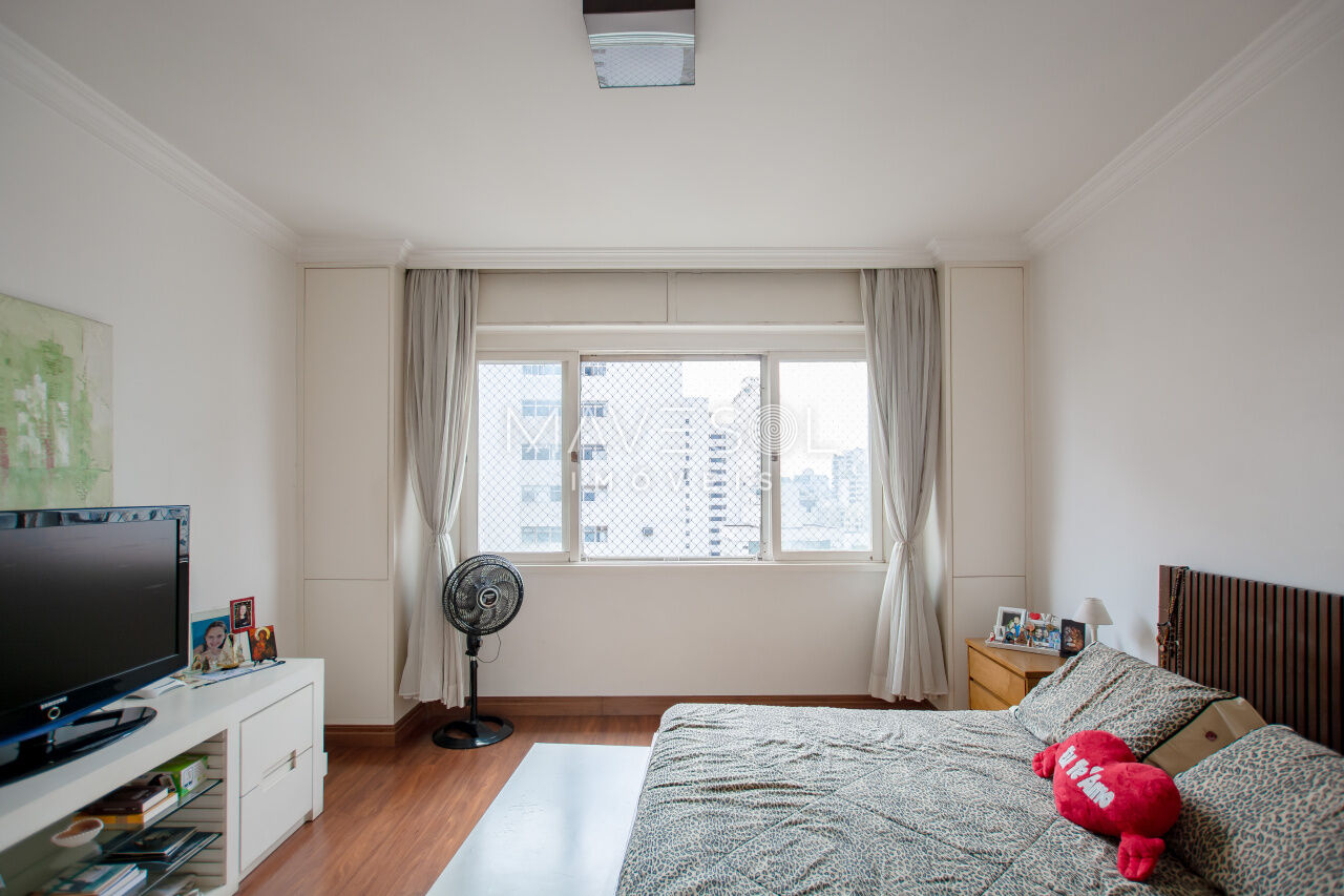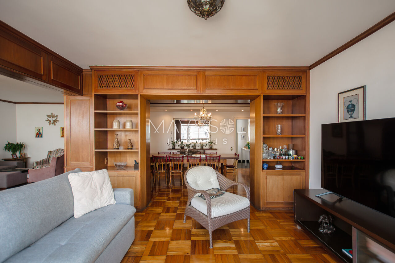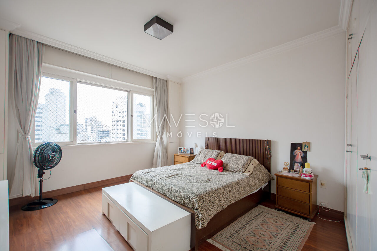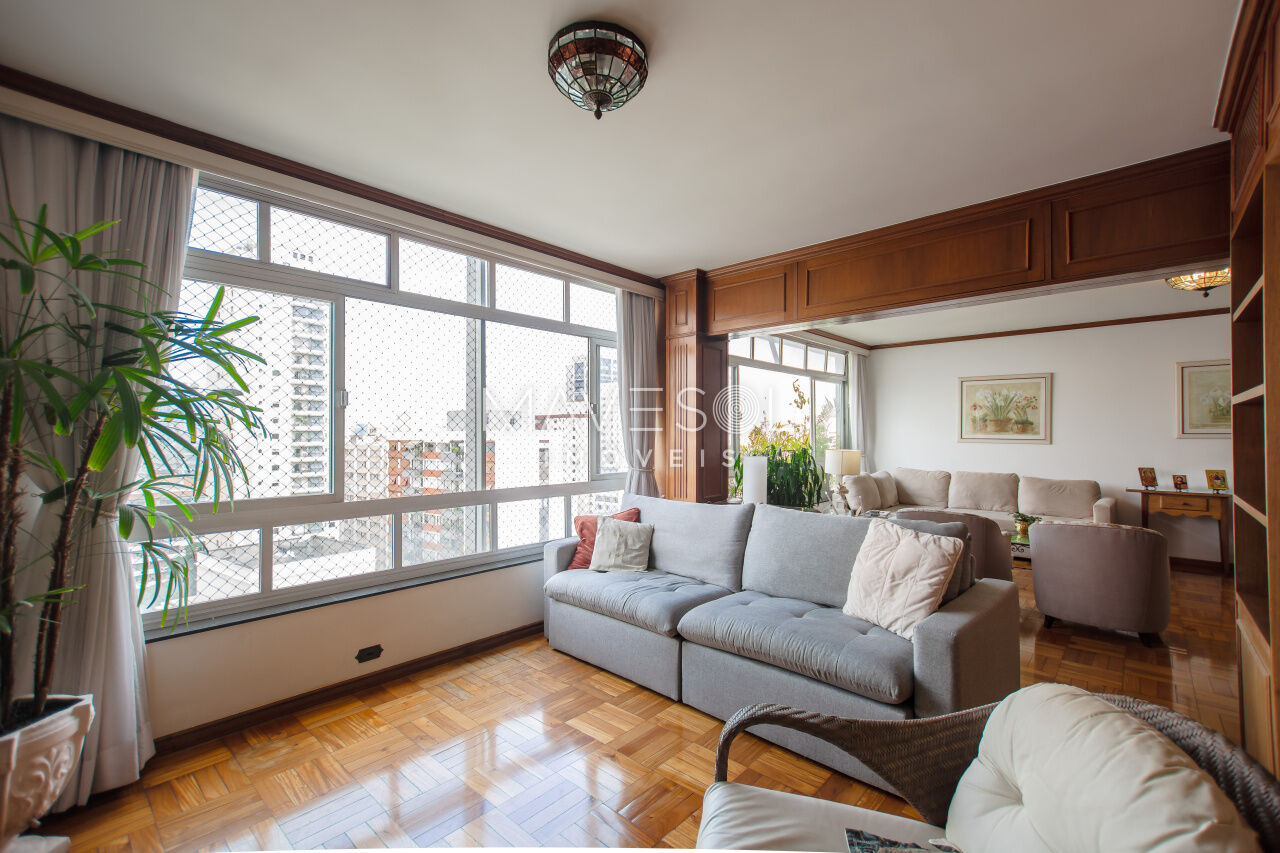 Apartamento amplo e ensolarado com vista linda para o skyline paulista, em localização privilegiada, próximo de todas as facilidades do bairro, padarias, cafés, praças, restaurantes e do Shopping Higienópolis. O living espaçoso com janelões de parede a parede acomoda três ambientes de forma confortável, incluindo sala de jantar, sala de TV e lavabo. A copa-cozinha é funcional e bem planejada. A planta original possui três dormitórios, sendo uma suíte mais sala intima, com a reforma, tem o quarto dormitório, que originalmente é o quarto de empregada, também conta com dois banheiros, todos com armários .