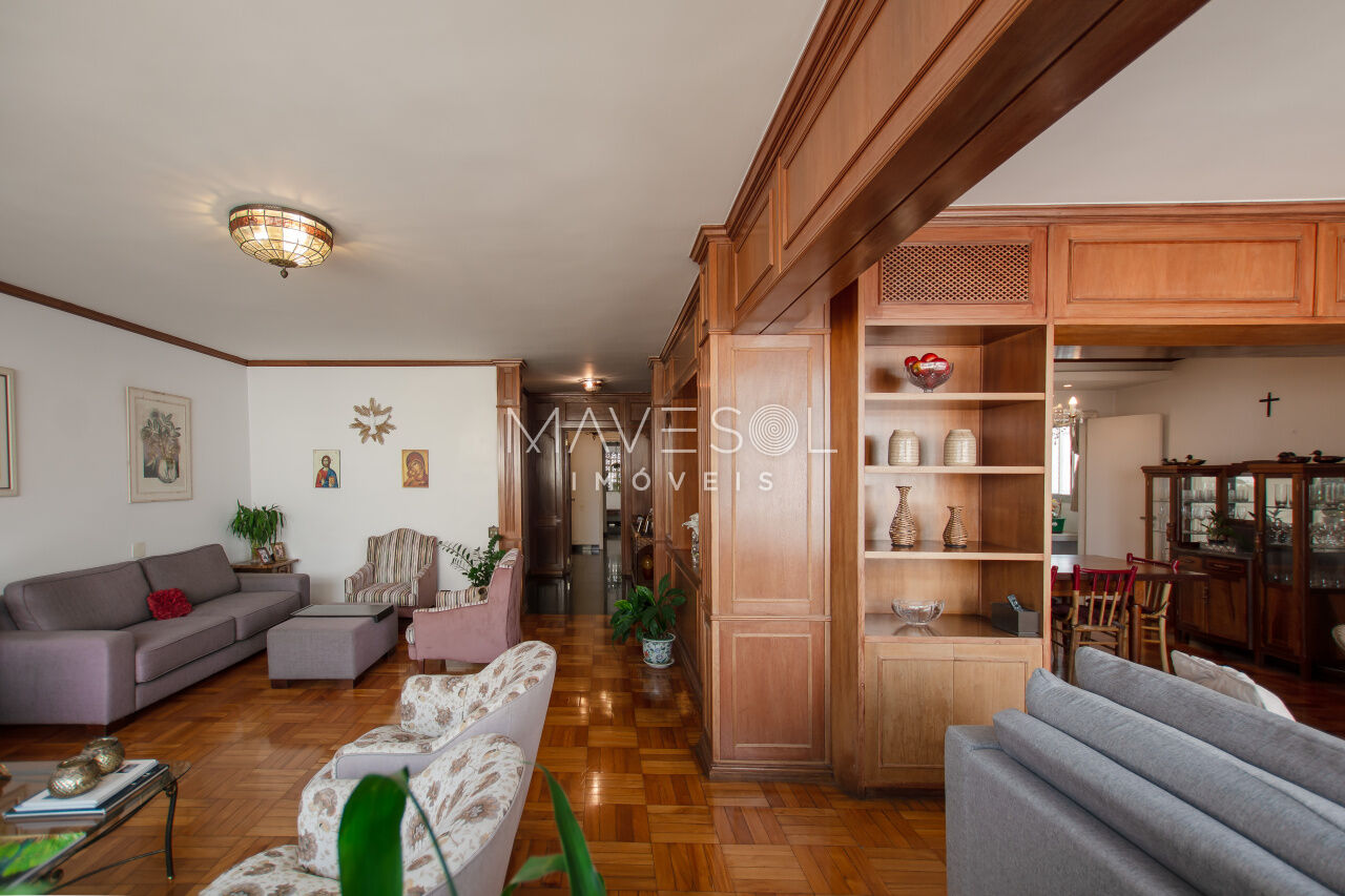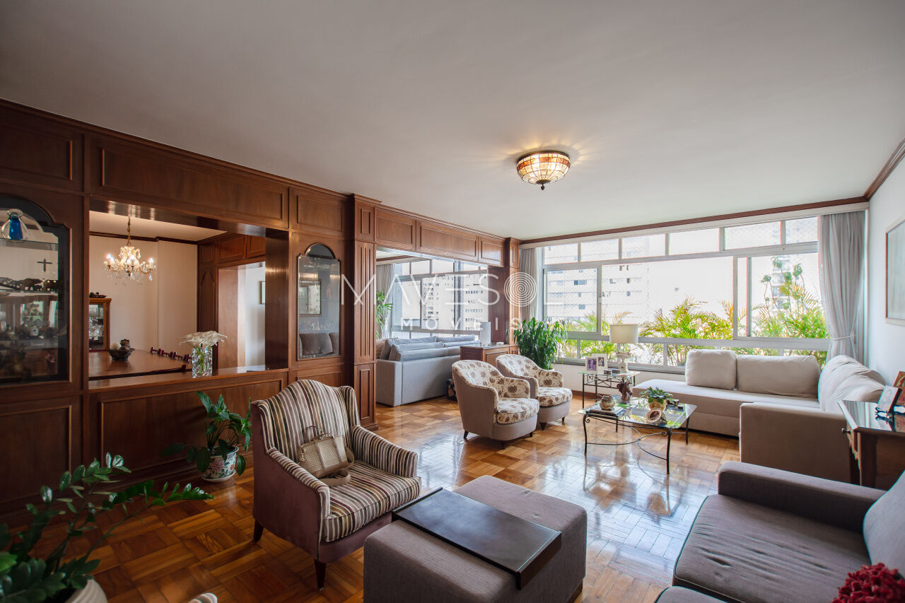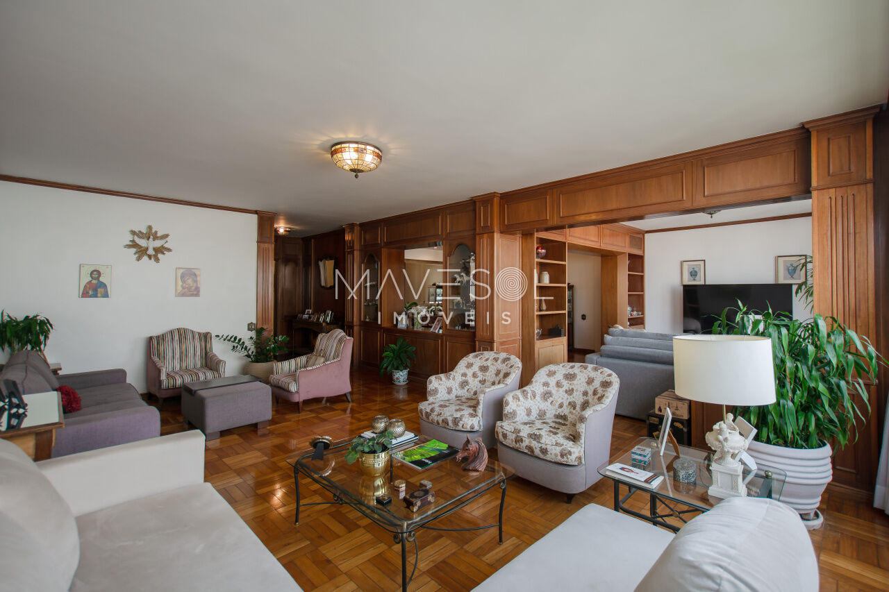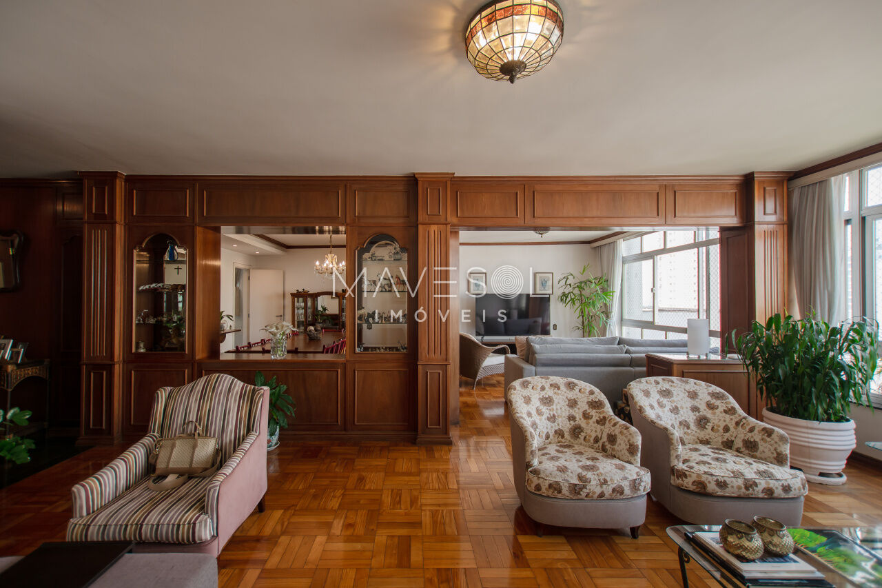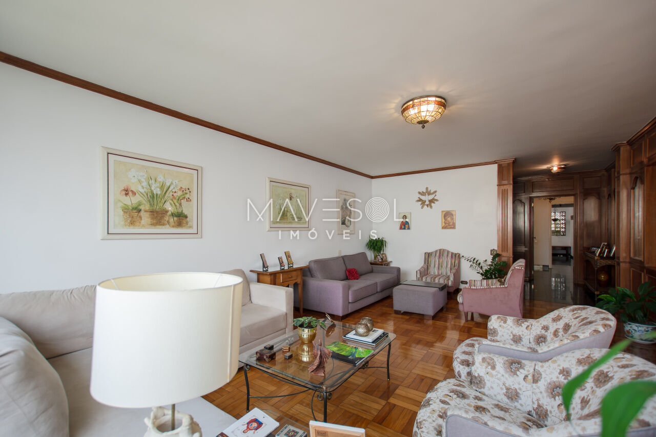 Apartamento amplo e ensolarado com vista linda para o skyline paulista, em localização privilegiada, próximo de todas as facilidades do bairro, padarias, cafés, praças, restaurantes e do Shopping Higienópolis. O living espaçoso com janelões de parede a parede acomoda três ambientes de forma confortável, incluindo sala de jantar, sala de TV e lavabo. A copa-cozinha é funcional e bem planejada. A planta original possui três dormitórios, sendo uma suíte mais sala intima, com a reforma, tem o quarto dormitório, que originalmente é o quarto de empregada, também conta com dois banheiros, todos com armários .