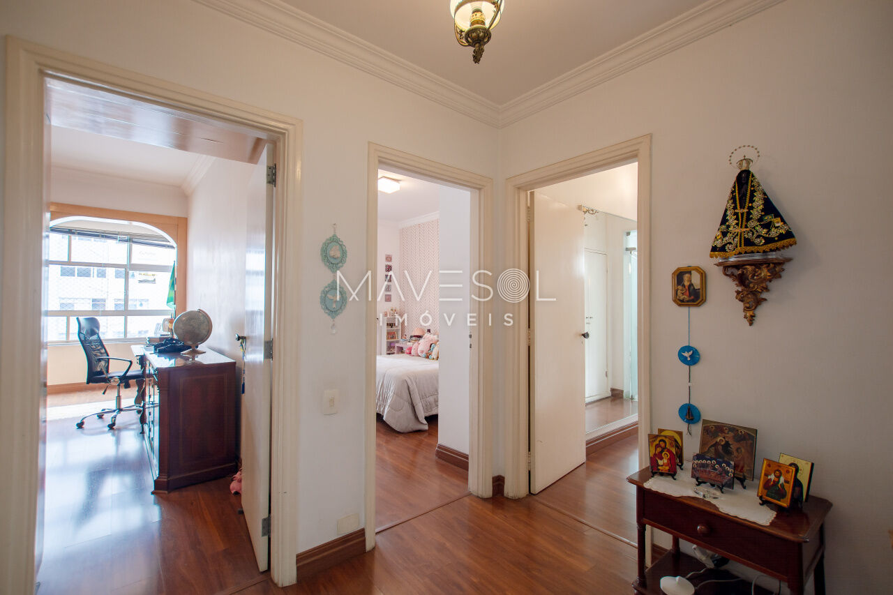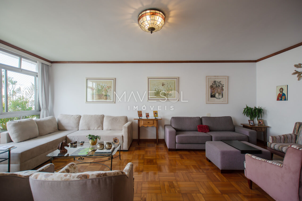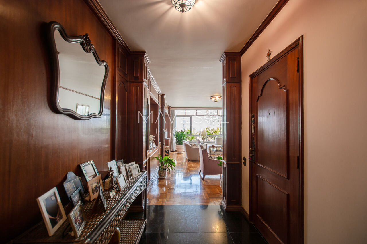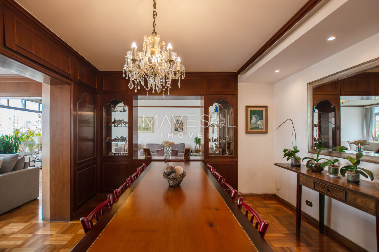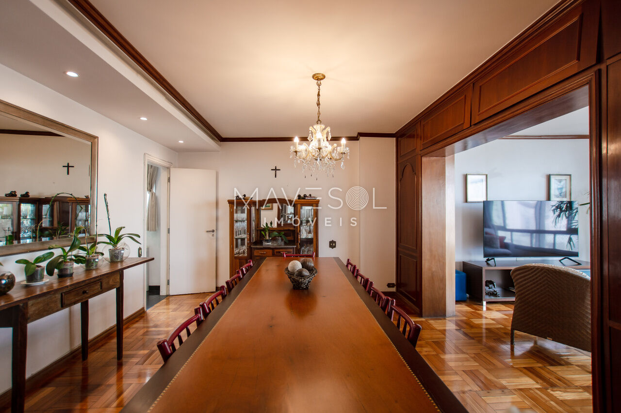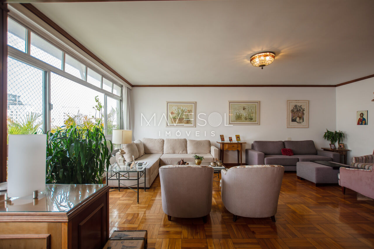 Apartamento amplo e ensolarado com vista linda para o skyline paulista, em localização privilegiada, próximo de todas as facilidades do bairro, padarias, cafés, praças, restaurantes e do Shopping Higienópolis. O living espaçoso com janelões de parede a parede acomoda três ambientes de forma confortável, incluindo sala de jantar, sala de TV e lavabo. A copa-cozinha é funcional e bem planejada. A planta original possui três dormitórios, sendo uma suíte mais sala intima, com a reforma, tem o quarto dormitório, que originalmente é o quarto de empregada, também conta com dois banheiros, todos com armários .