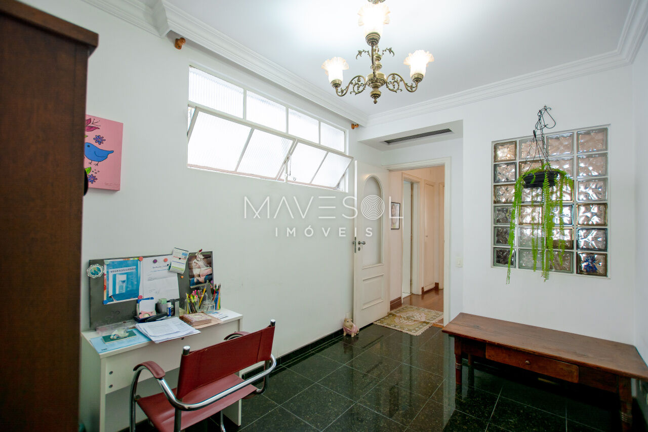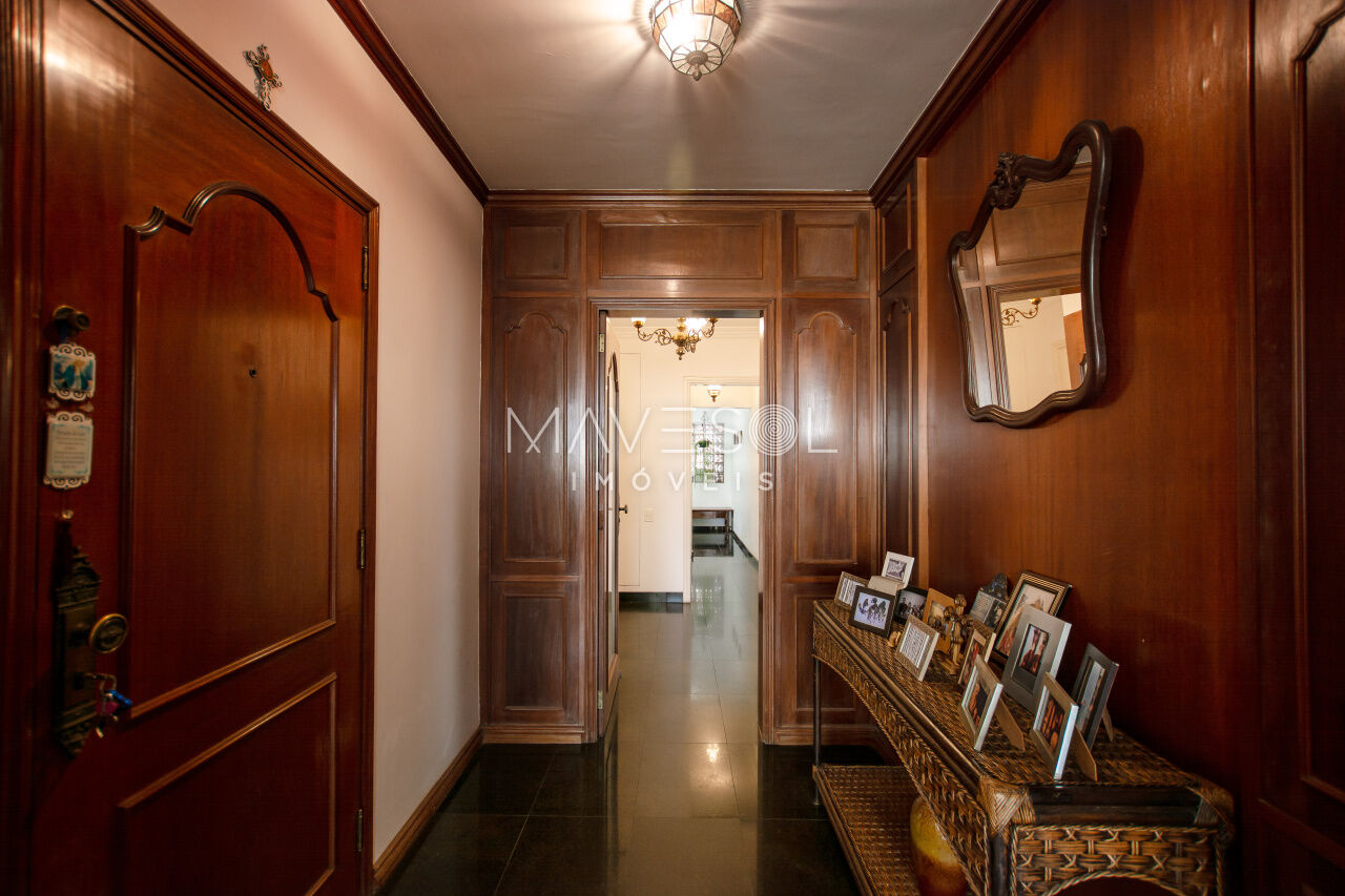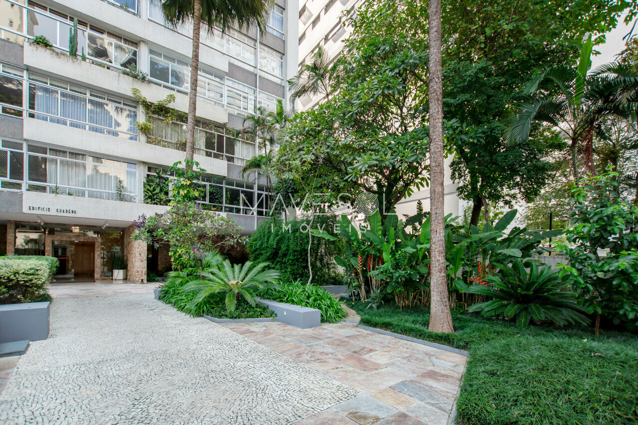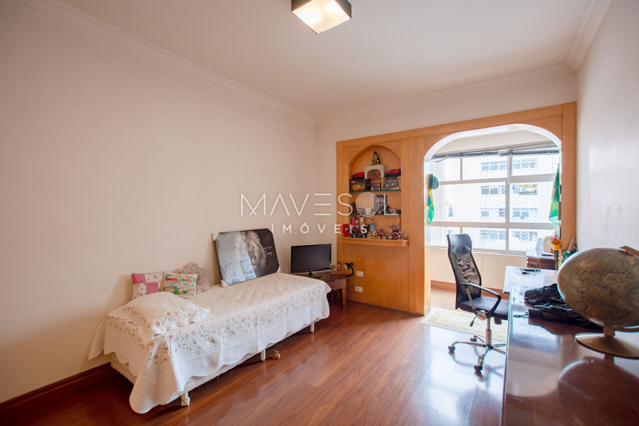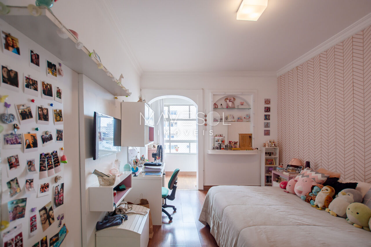 Apartamento amplo e ensolarado com vista linda para o skyline paulista, em localização privilegiada, próximo de todas as facilidades do bairro, padarias, cafés, praças, restaurantes e do Shopping Higienópolis. O living espaçoso com janelões de parede a parede acomoda três ambientes de forma confortável, incluindo sala de jantar, sala de TV e lavabo. A copa-cozinha é funcional e bem planejada. A planta original possui três dormitórios, sendo uma suíte mais sala intima, com a reforma, tem o quarto dormitório, que originalmente é o quarto de empregada, também conta com dois banheiros, todos com armários .