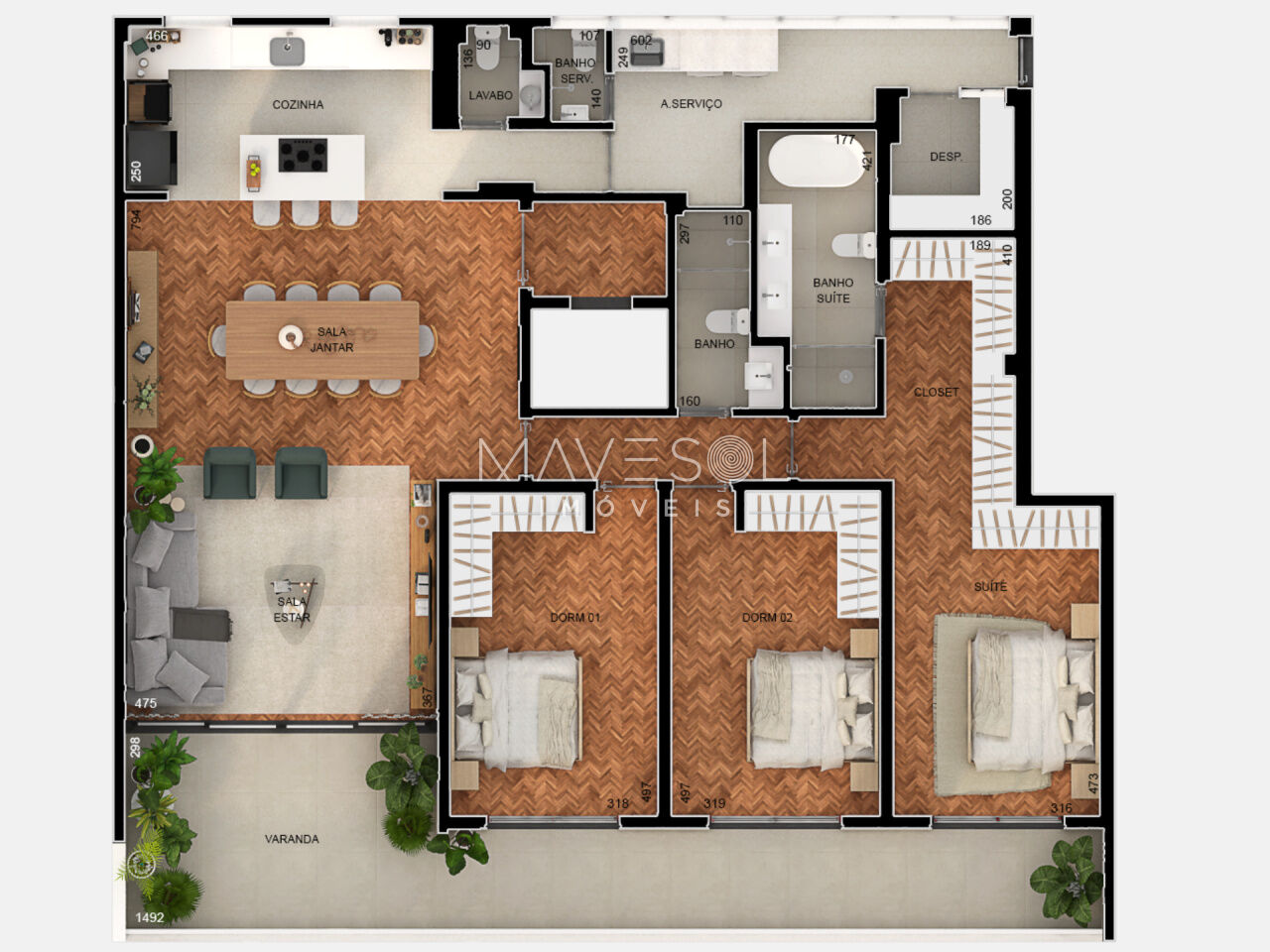 A planta original foi trabalhada para integrar espaços, e aproveitar ao máximo a luz natural, que é muito farta. Todos os 3 dormitórios, e a sala, tem acesso à varanda frontal.